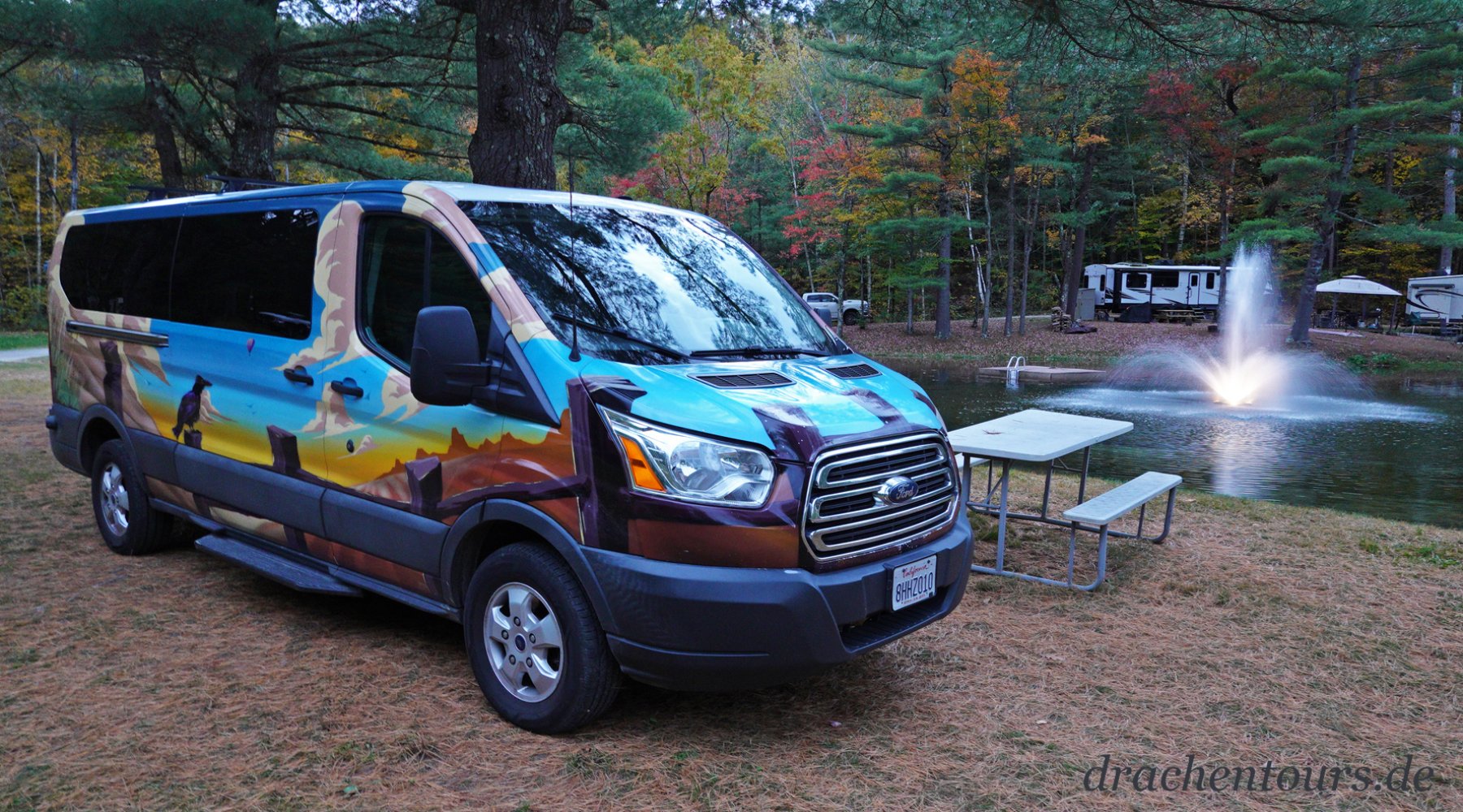 Hier sollte ich erwähnen, dass Camping (mit dem Van bzw. RV) in den U.S.A. und auch in Kanada sich von der Art in Europa deutlich unterscheidet. Ich kann mich hier nicht einfach in einer ruhigen Straße oder auf einem gewöhnlichen Parkplatz über Nacht zum Schlafen hinstellen.