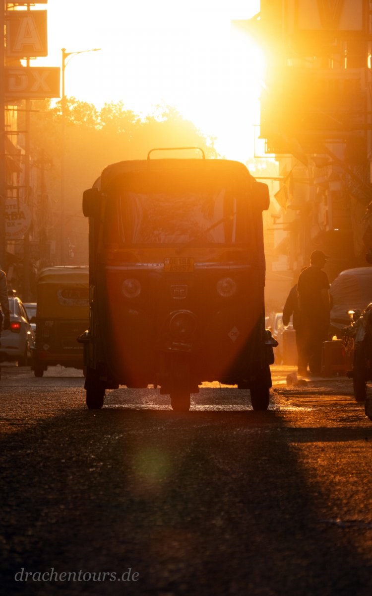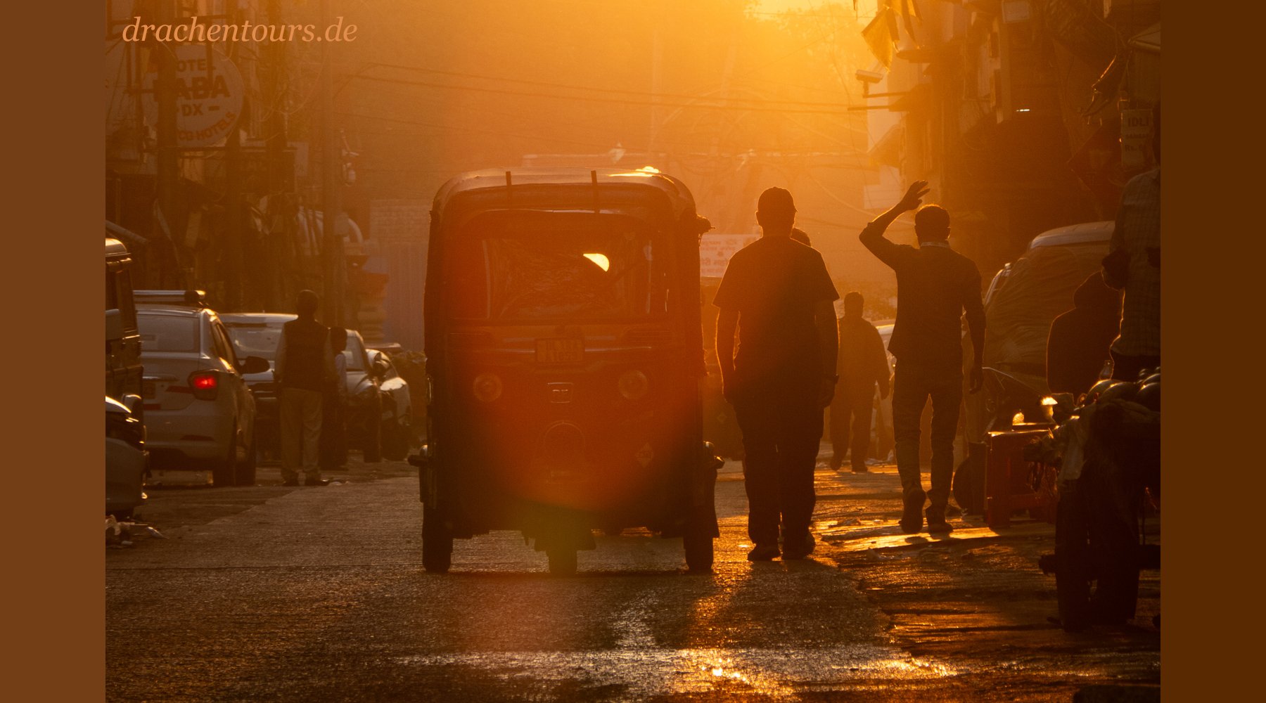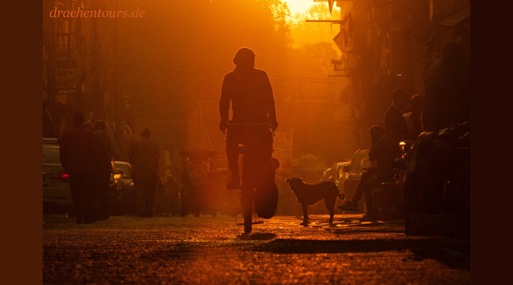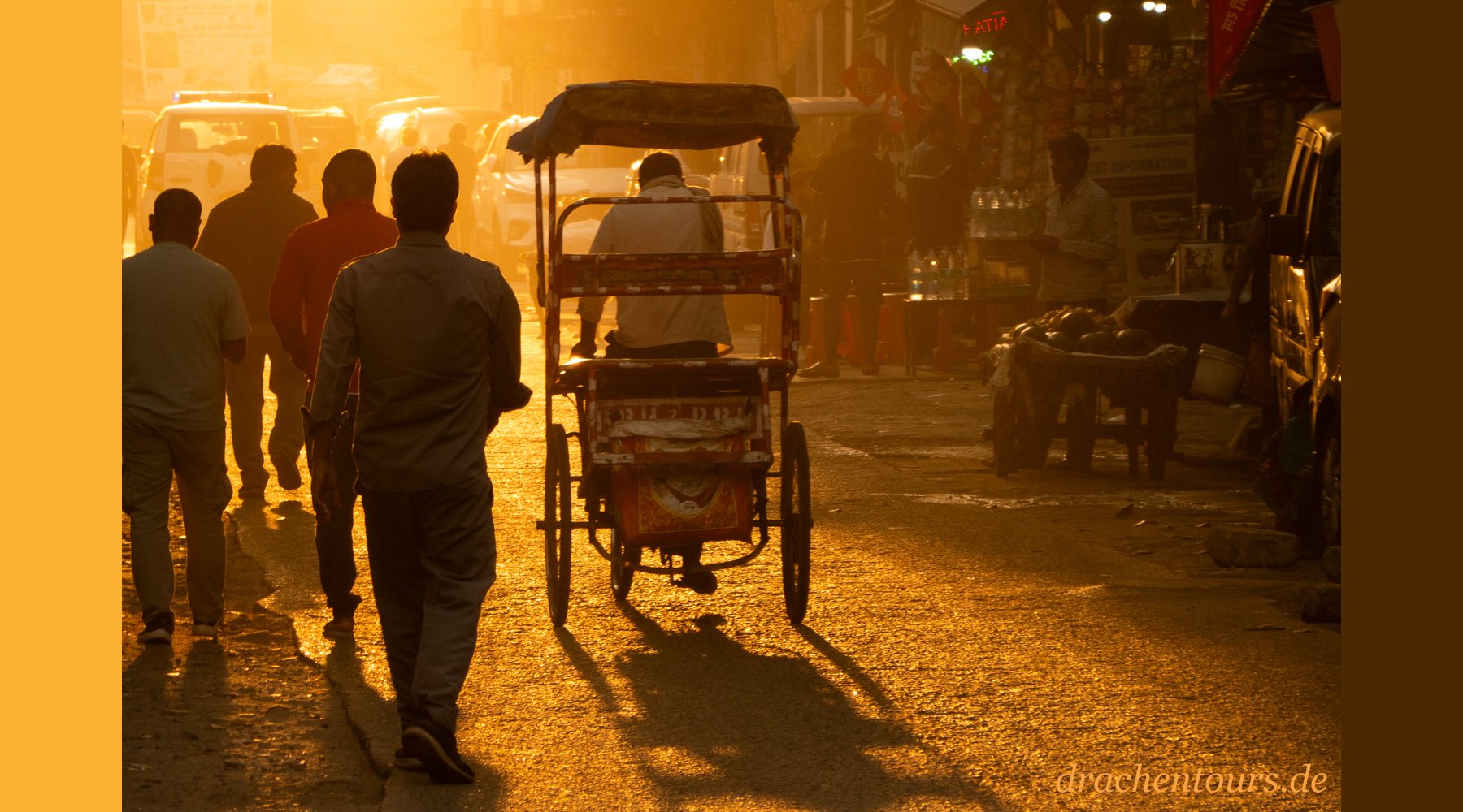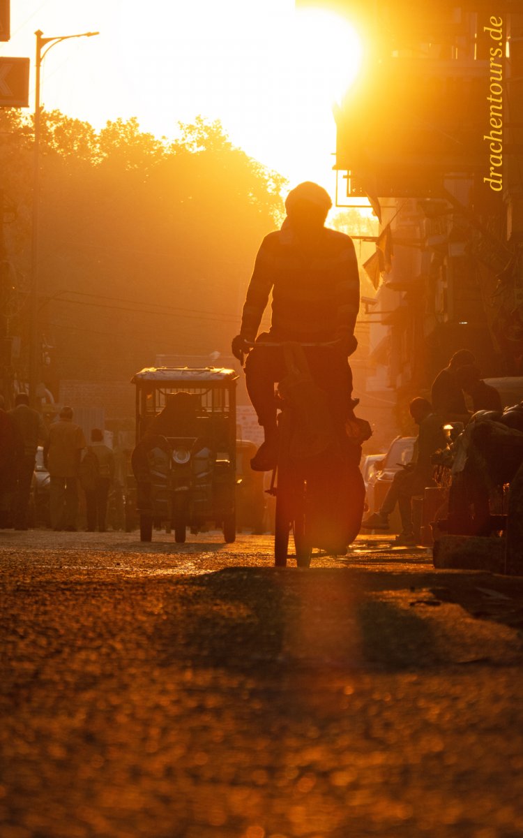 Das Leben ist hier bereits in vollem Gange. In der Morgensonne erstrahlen sowohl Passanten als auch Tiere und Rikschas in einem atemberaubenden Farbenspiel …