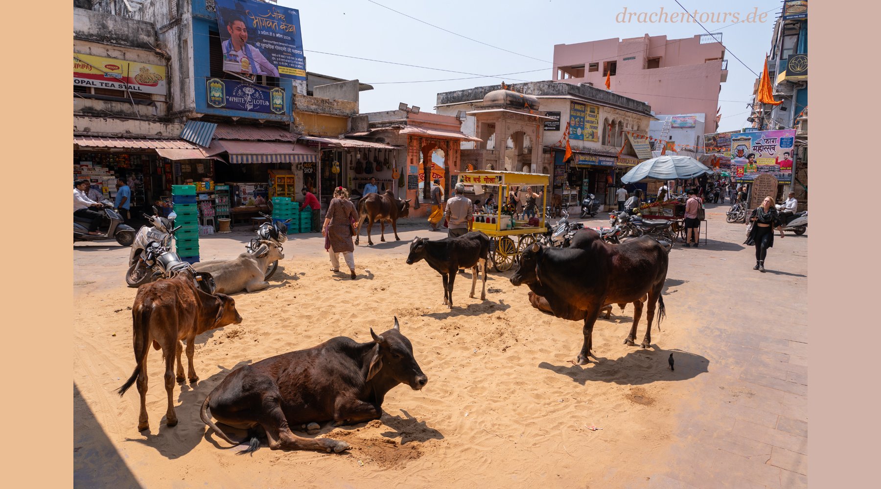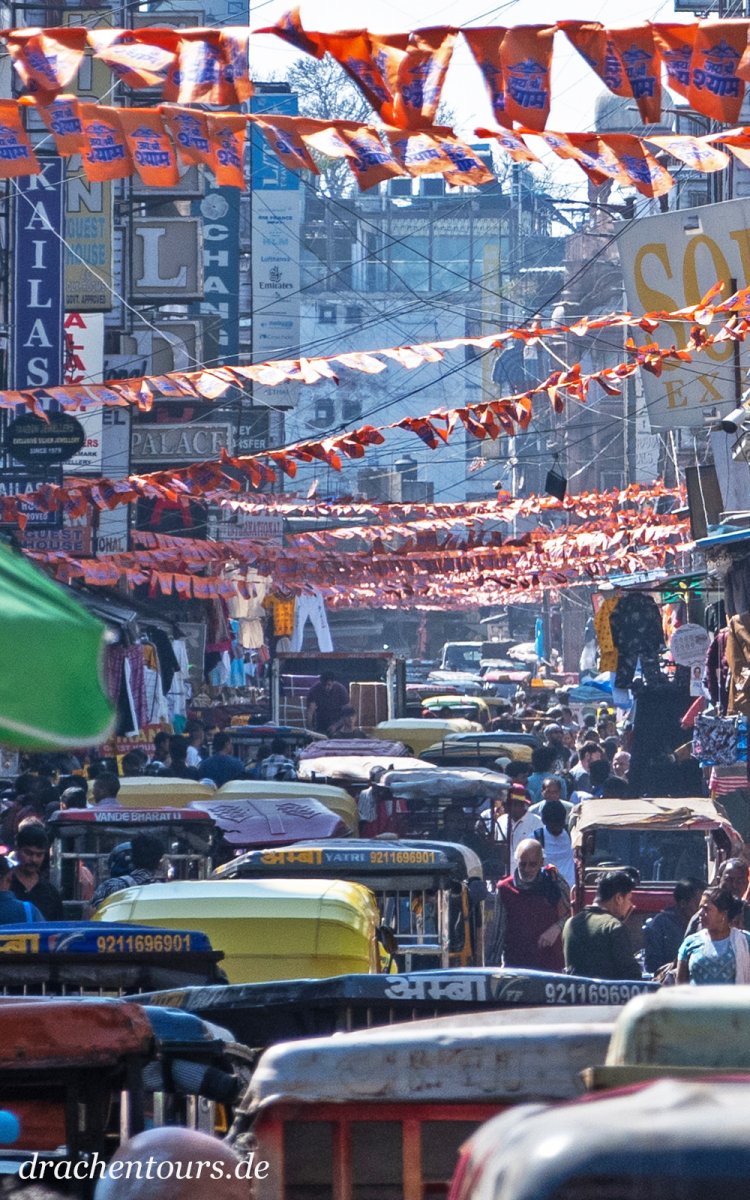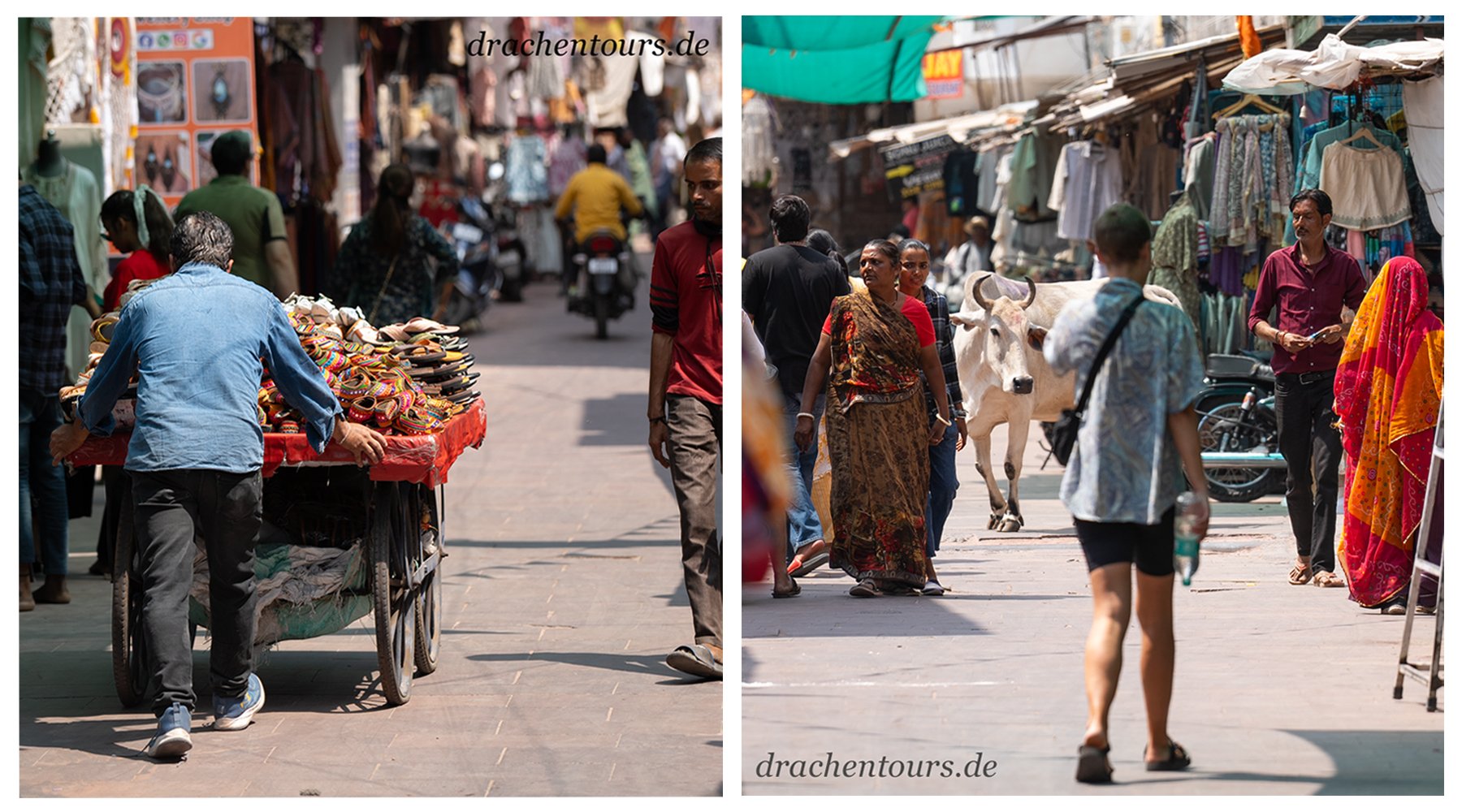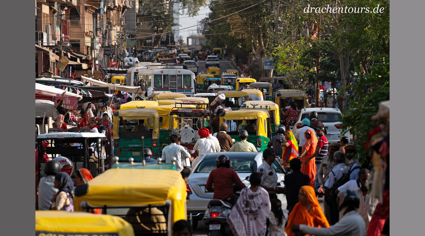 Das Leben ist hier bereits in vollem Gange. In der Morgensonne erstrahlen sowohl Passanten als auch Tiere und Rikschas in einem atemberaubenden Farbenspiel …