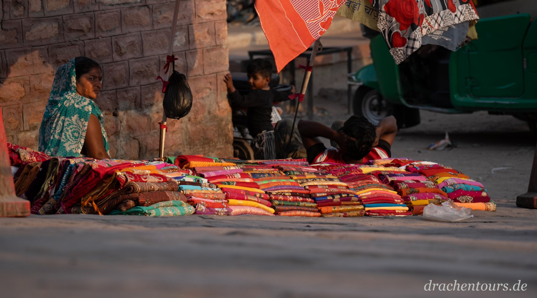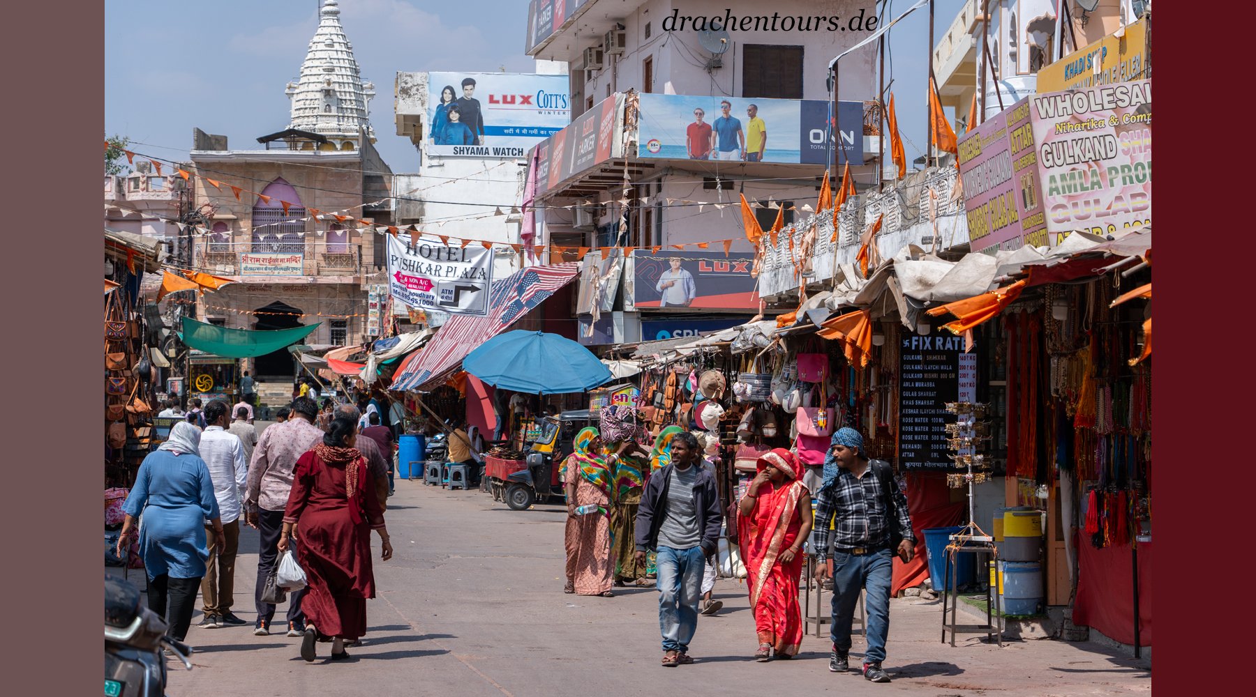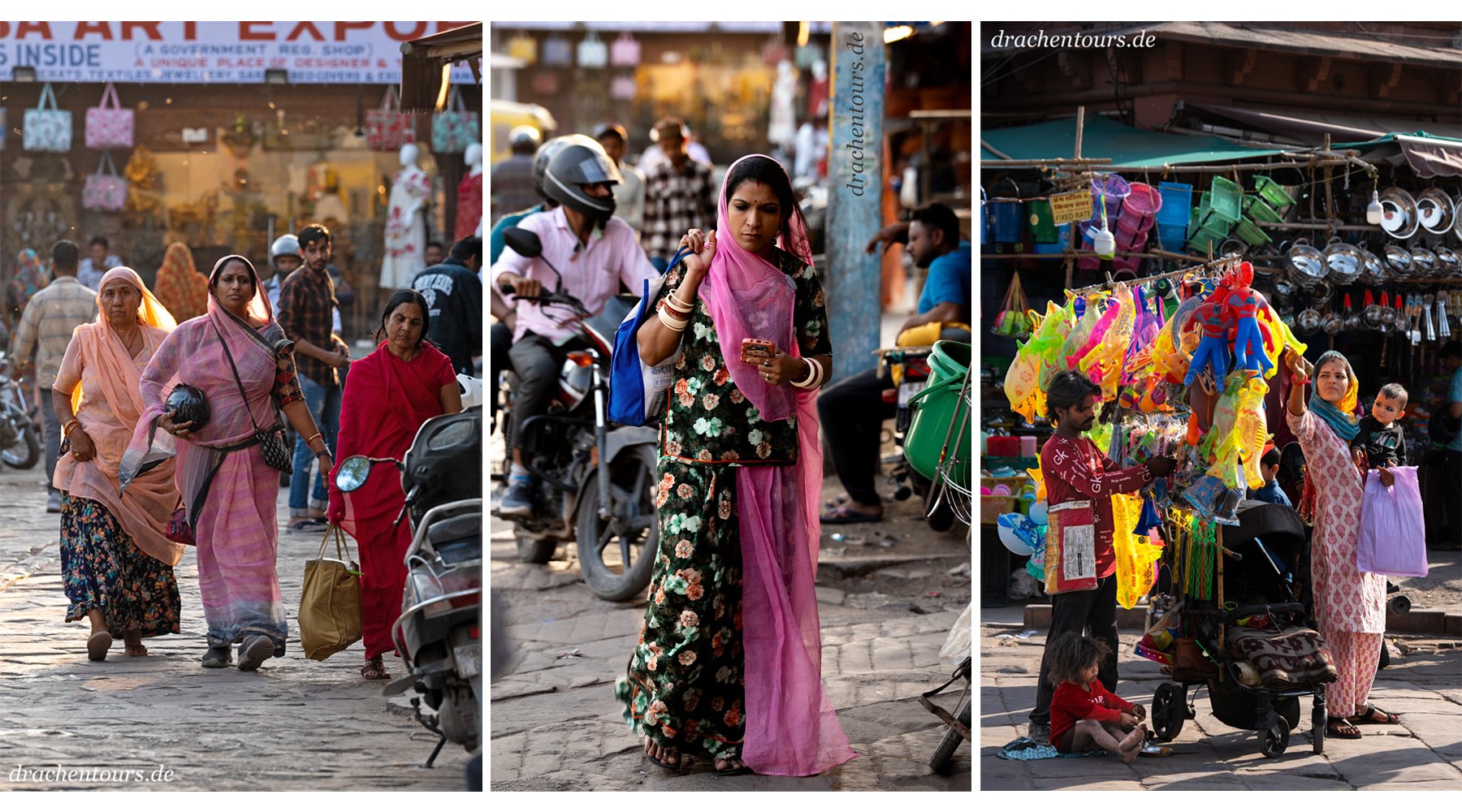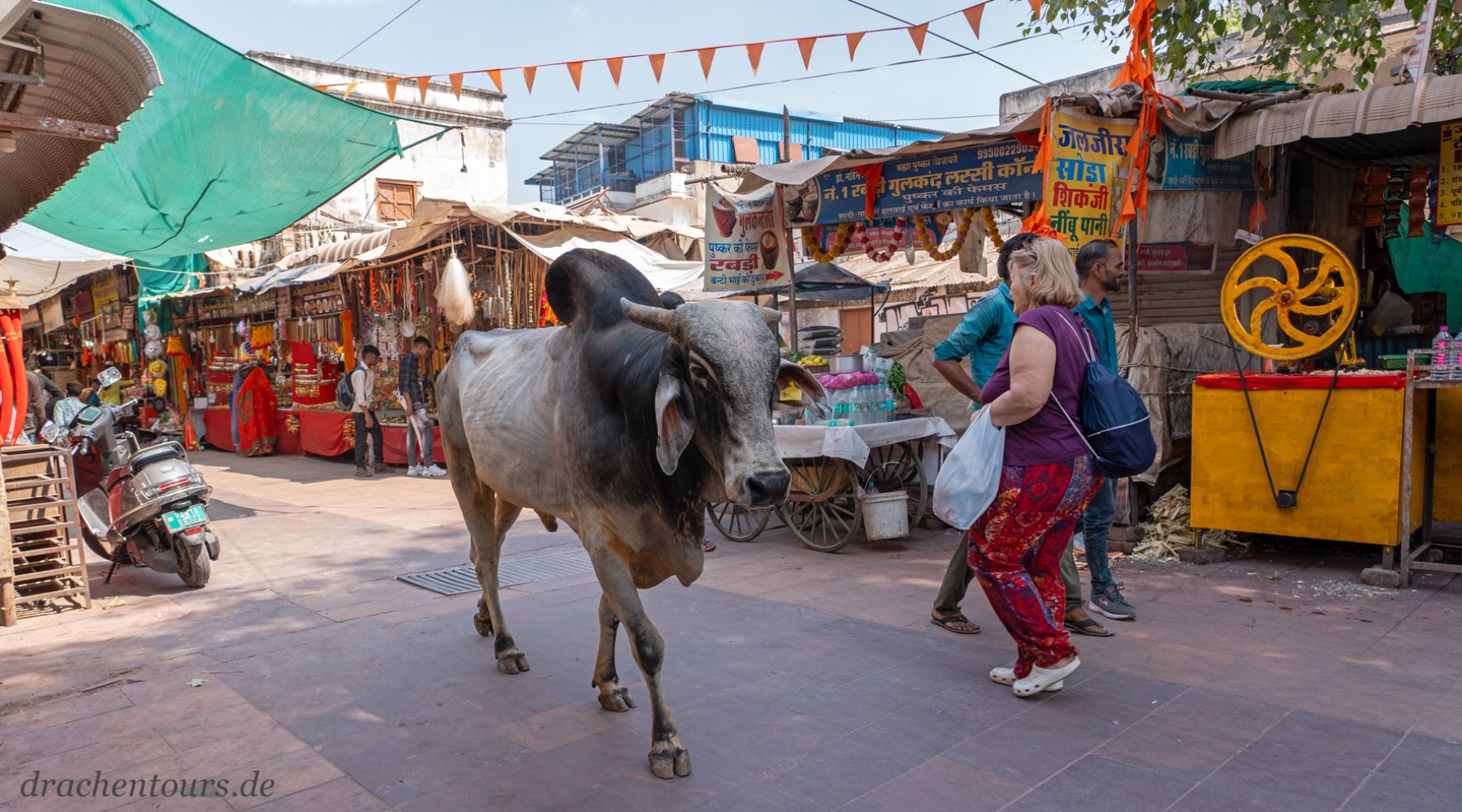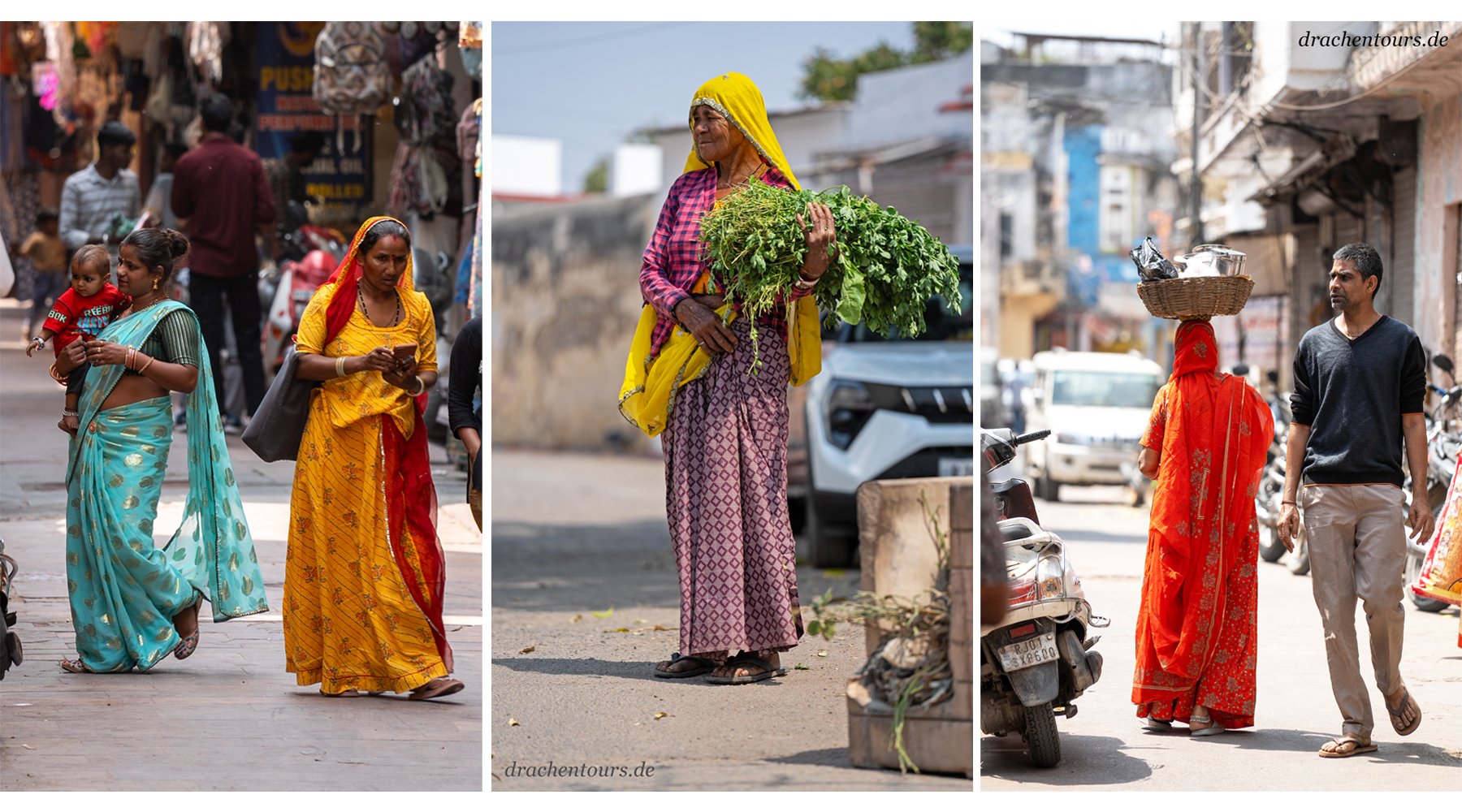 Das Leben ist hier bereits in vollem Gange. In der Morgensonne erstrahlen sowohl Passanten als auch Tiere und Rikschas in einem atemberaubenden Farbenspiel …