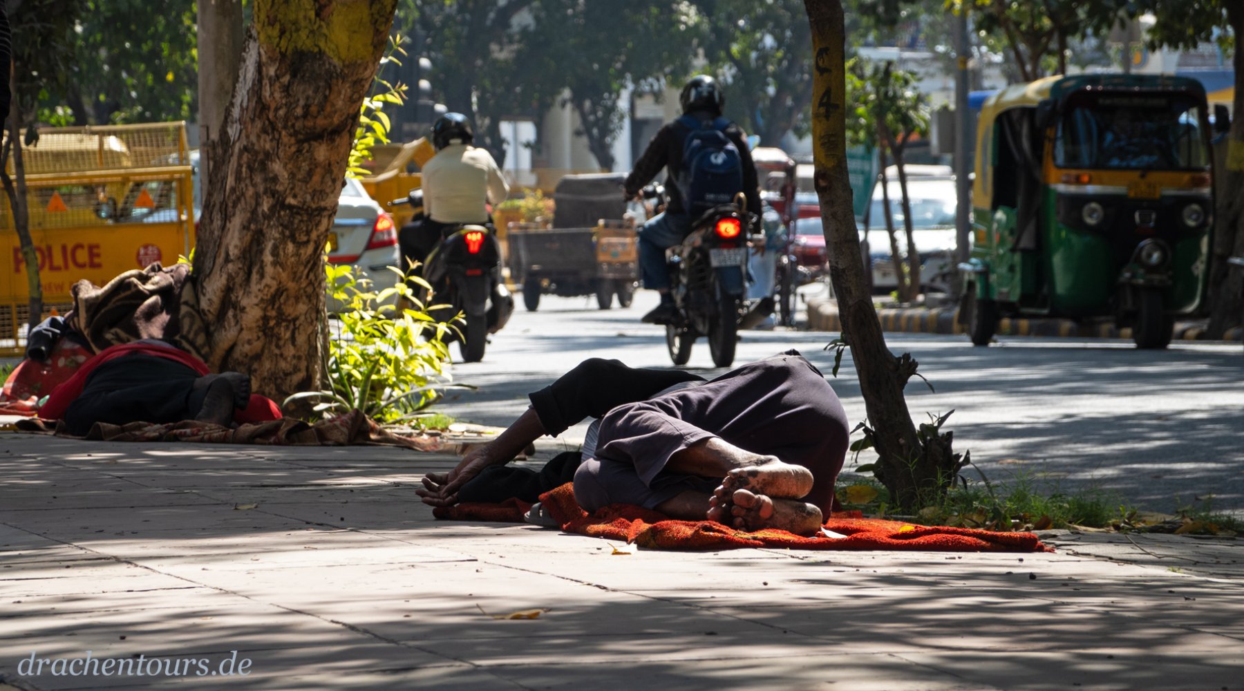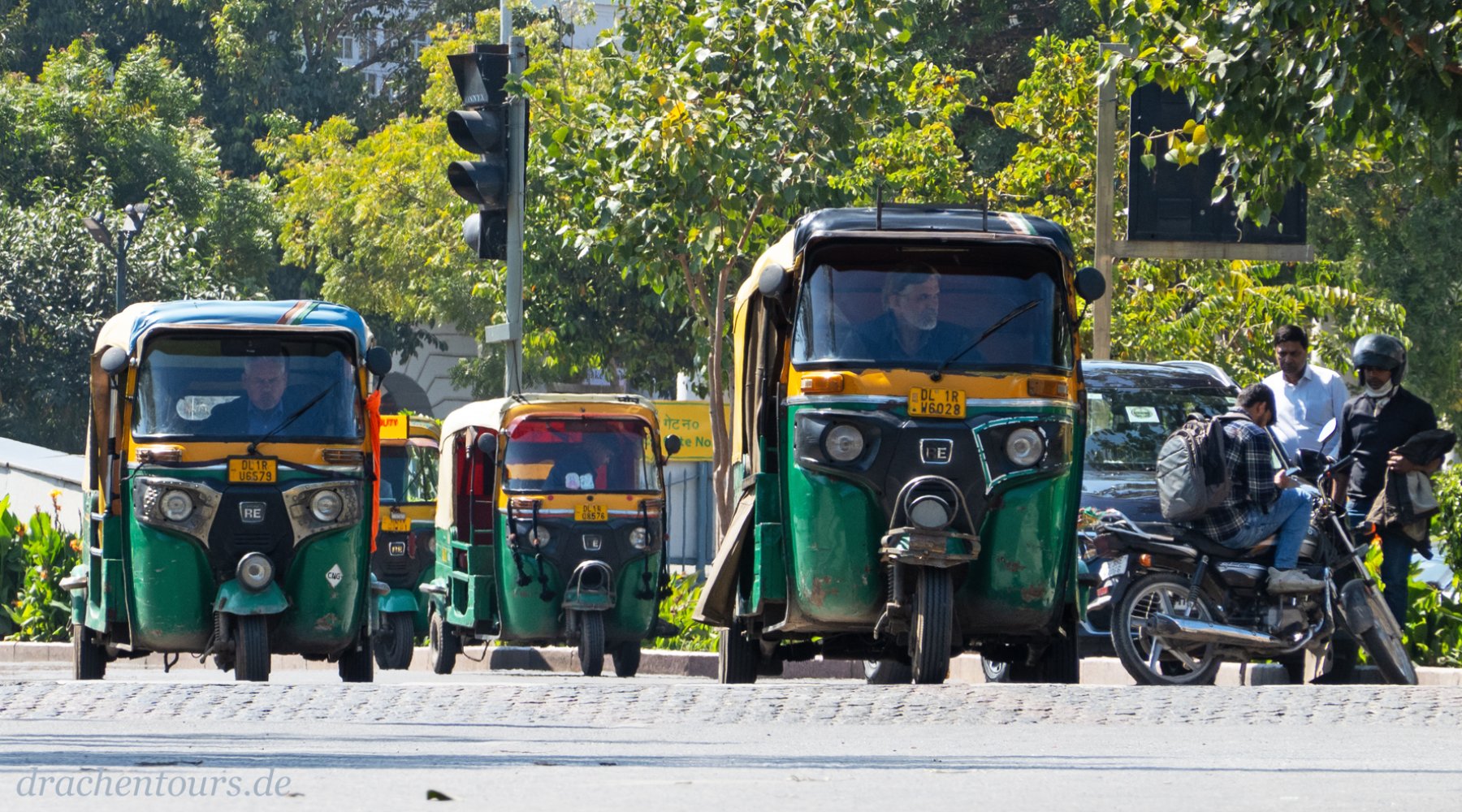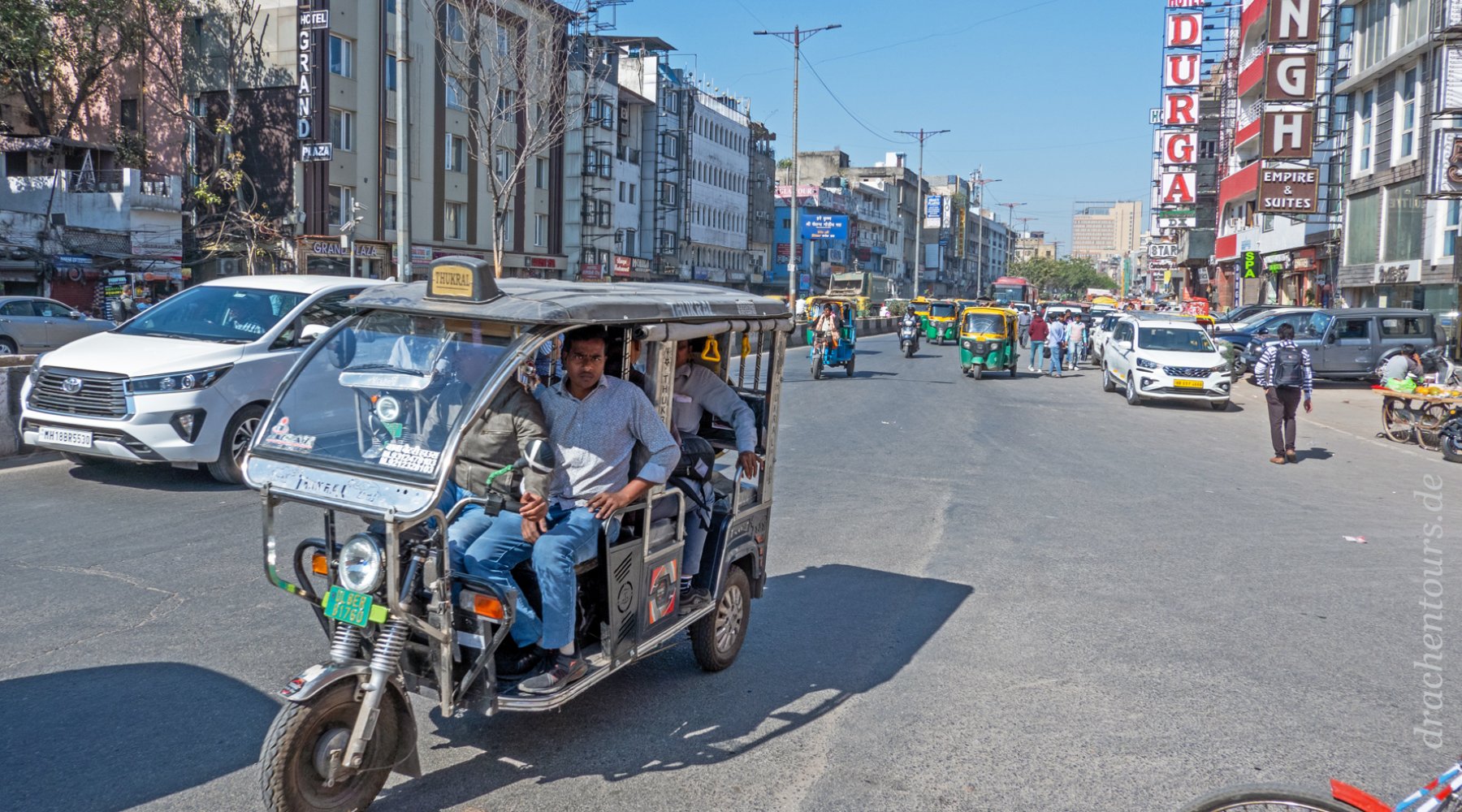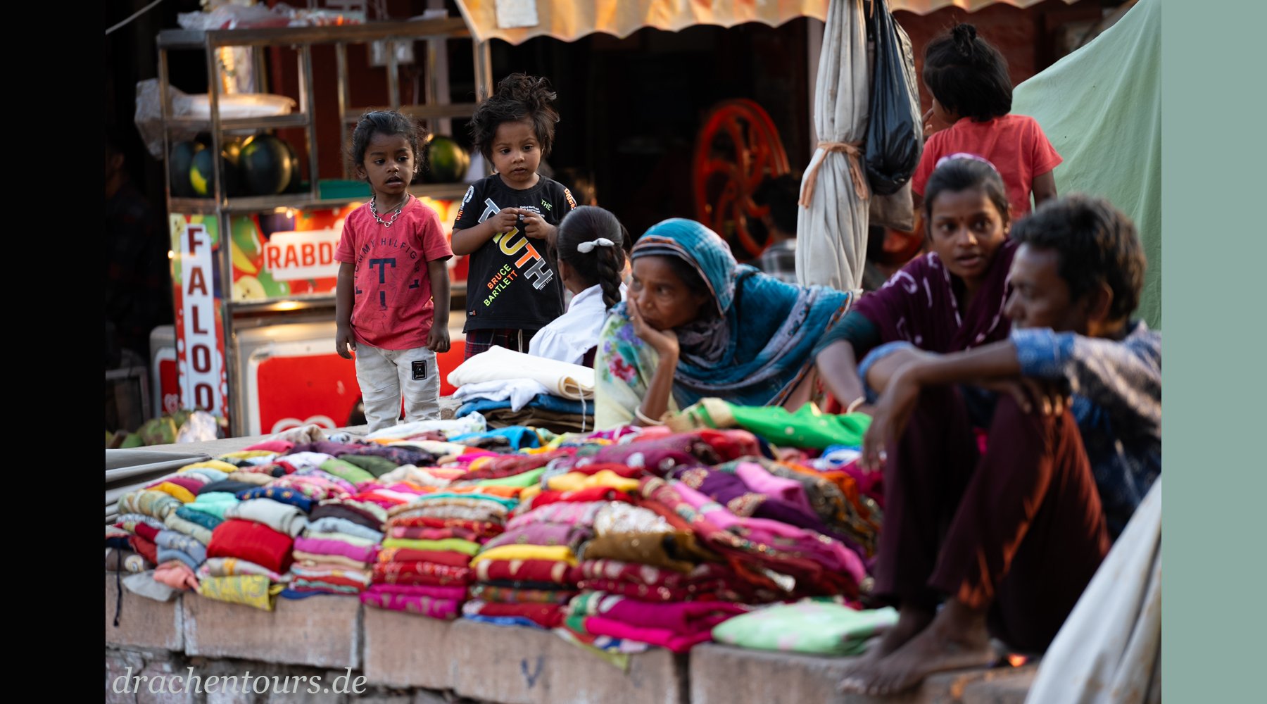 Das Leben ist hier bereits in vollem Gange. In der Morgensonne erstrahlen sowohl Passanten als auch Tiere und Rikschas in einem atemberaubenden Farbenspiel …