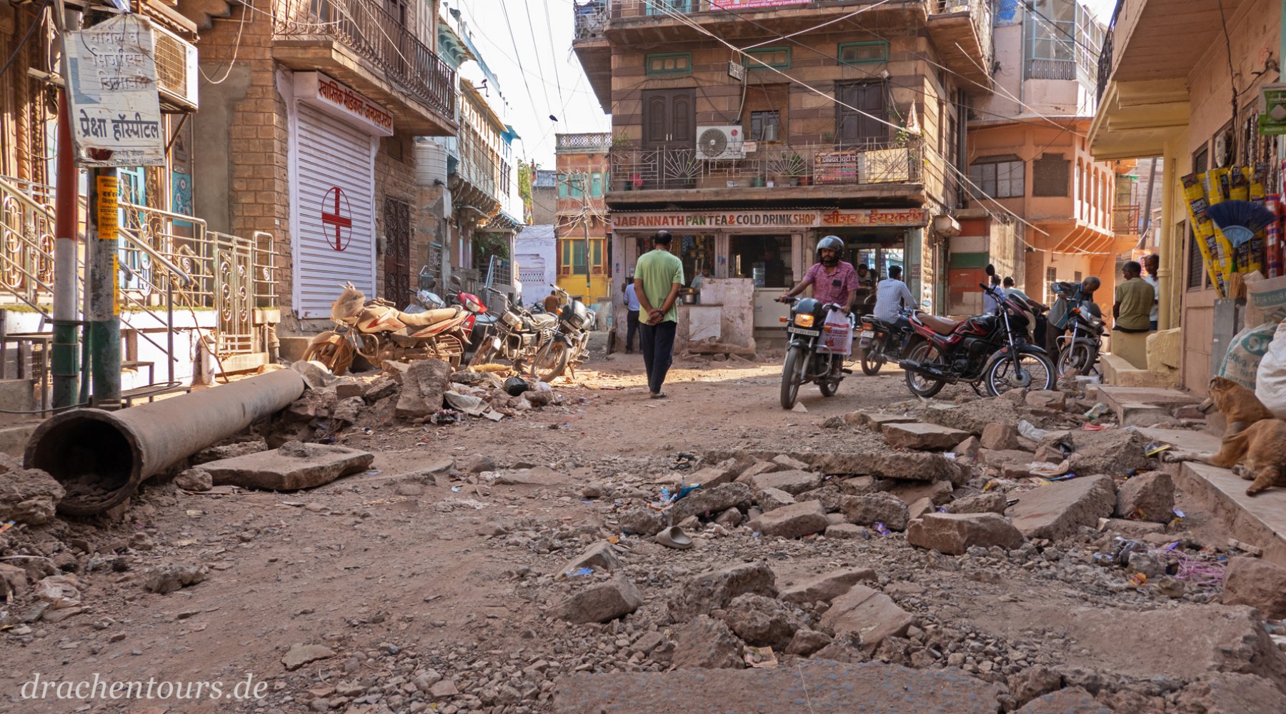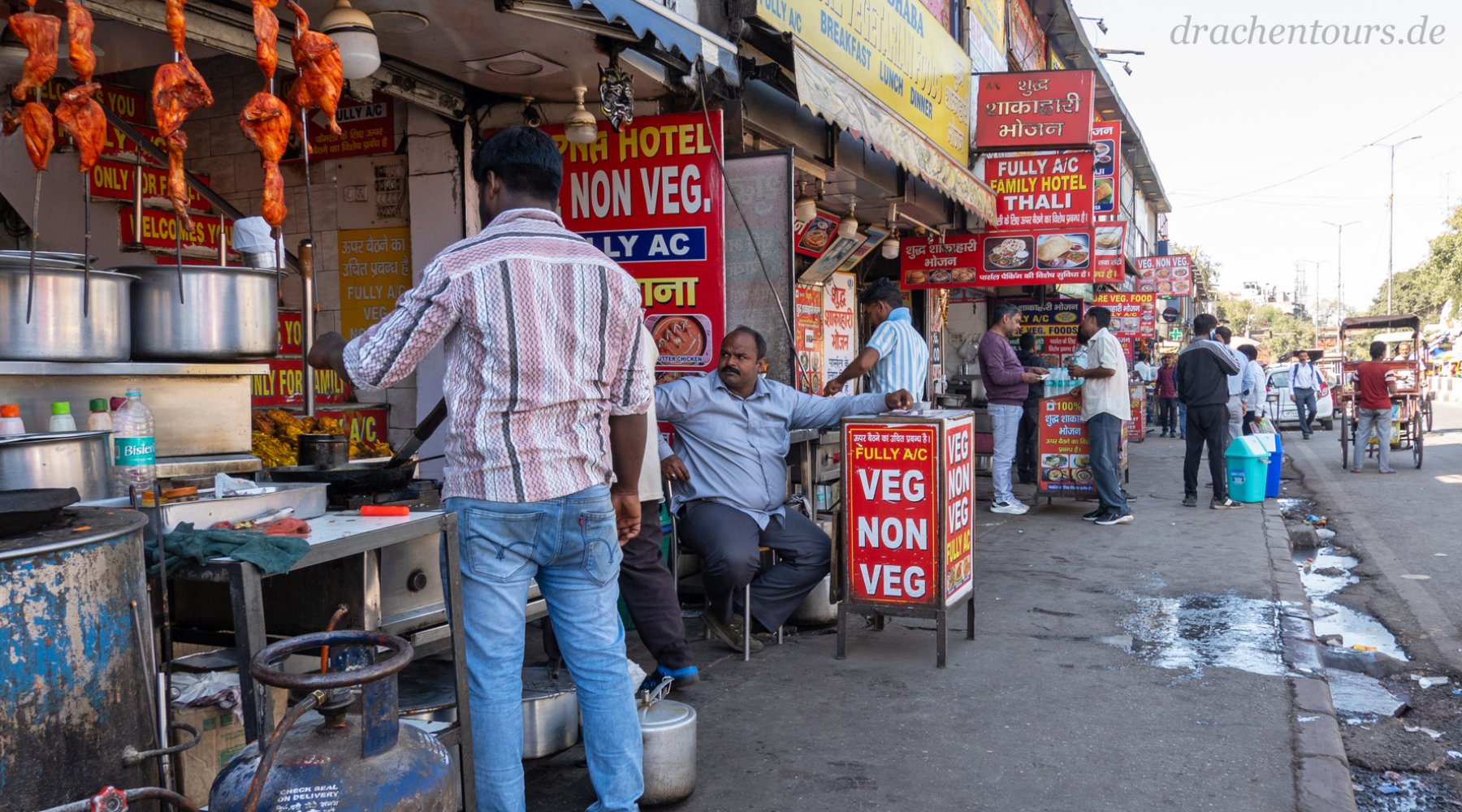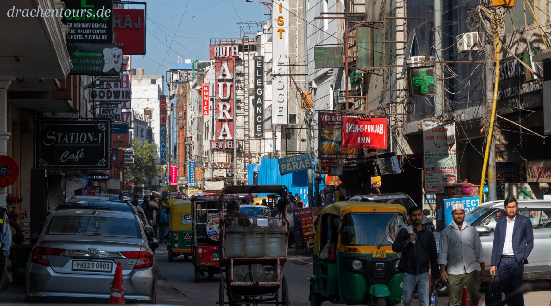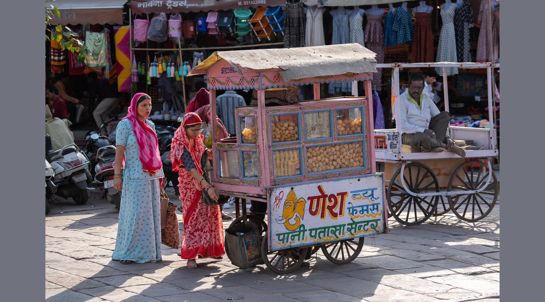 Das Leben ist hier bereits in vollem Gange. In der Morgensonne erstrahlen sowohl Passanten als auch Tiere und Rikschas in einem atemberaubenden Farbenspiel …