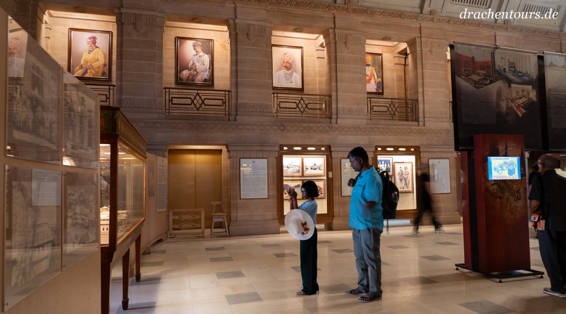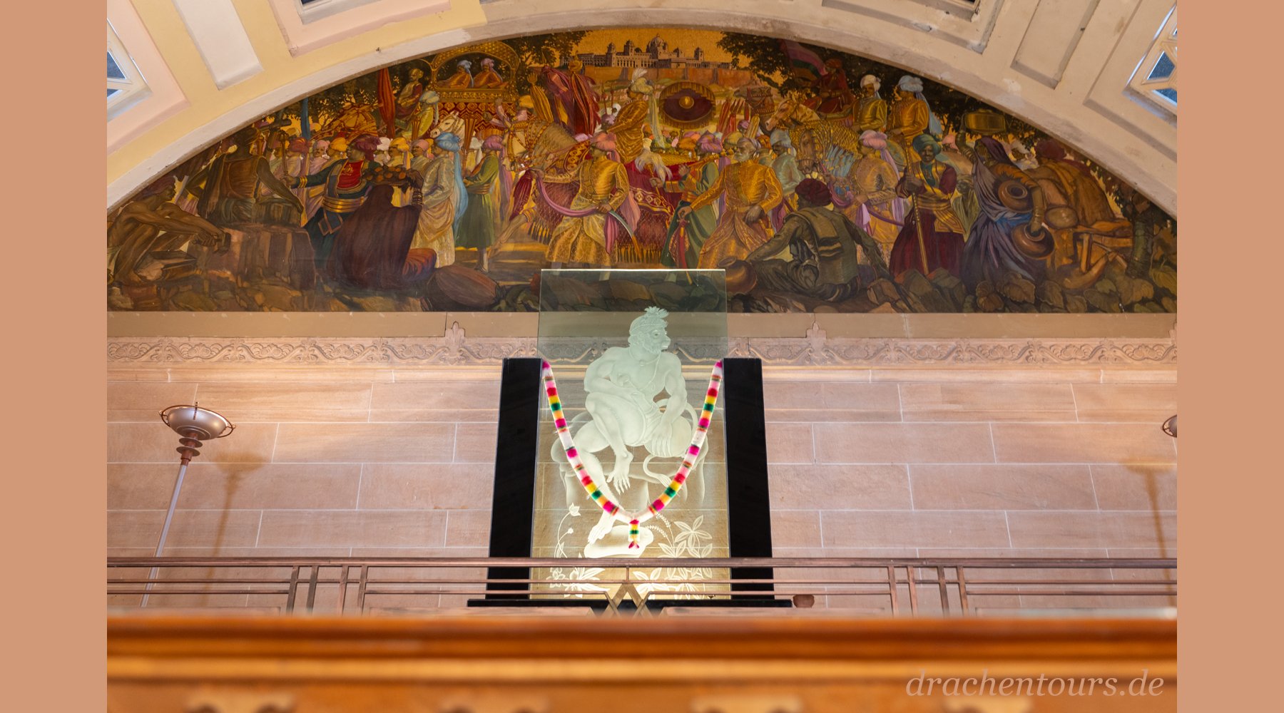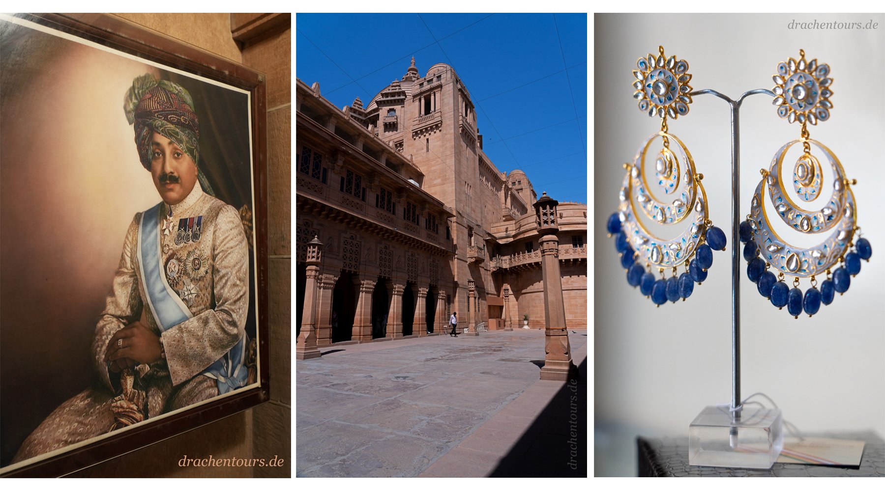 Als ich später das mittlere Begrüßungs-Foto (Foto 01 – Mitte) genauer betrachte, stelle ich bei der Recherche fest, dass selbst die indischen Herren-Turbane in ihrer Form und Art den gesellschaftlichen Stand wieder spiegeln. (Foto hinten links an der Wand: Prinz Manvendra Singh Gohil)