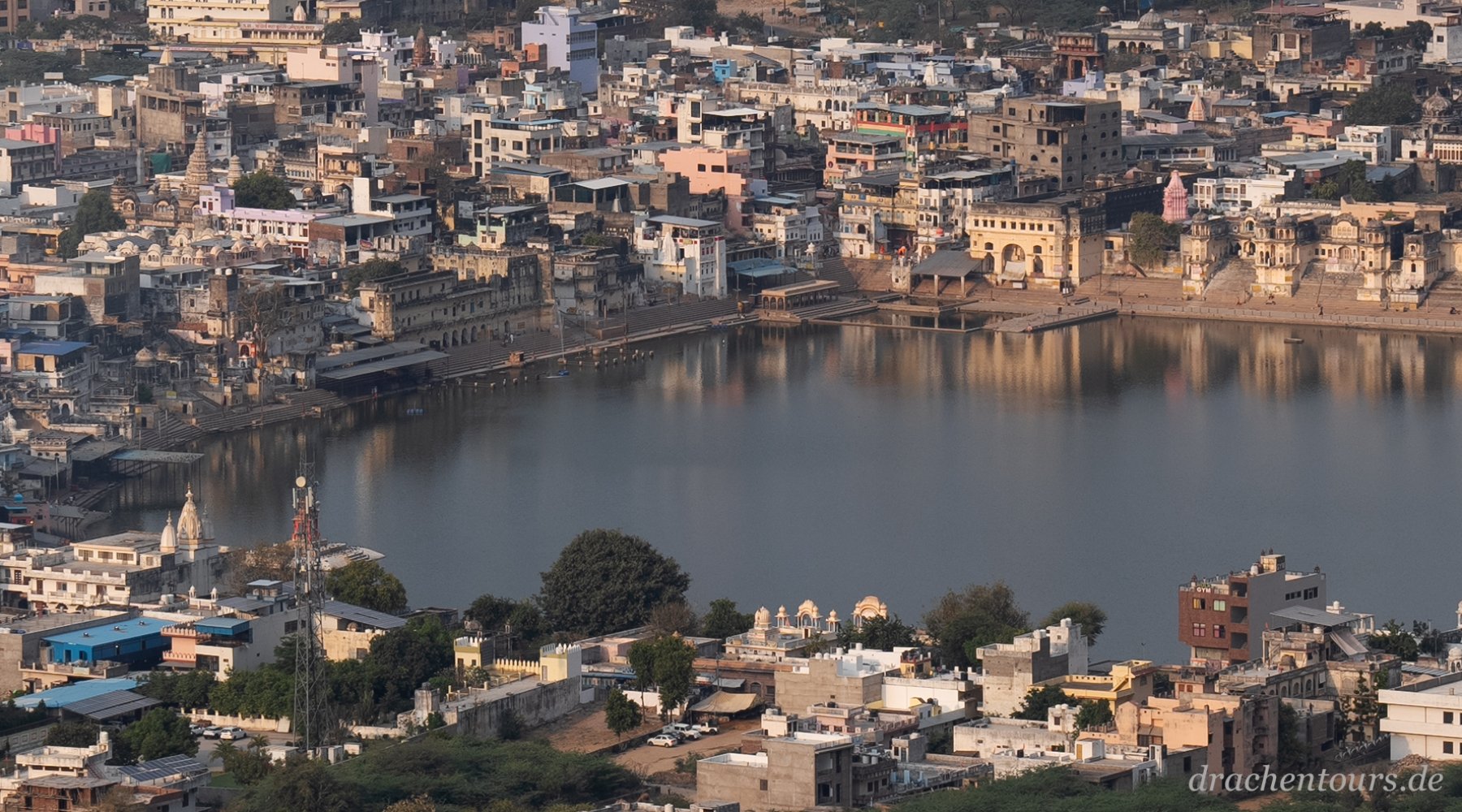 Im Licht der untergehenden Sonne ein letzter Blick auf die Innenstadt (mit Stadtpalast und Rückseite des Palasts der Winde).
