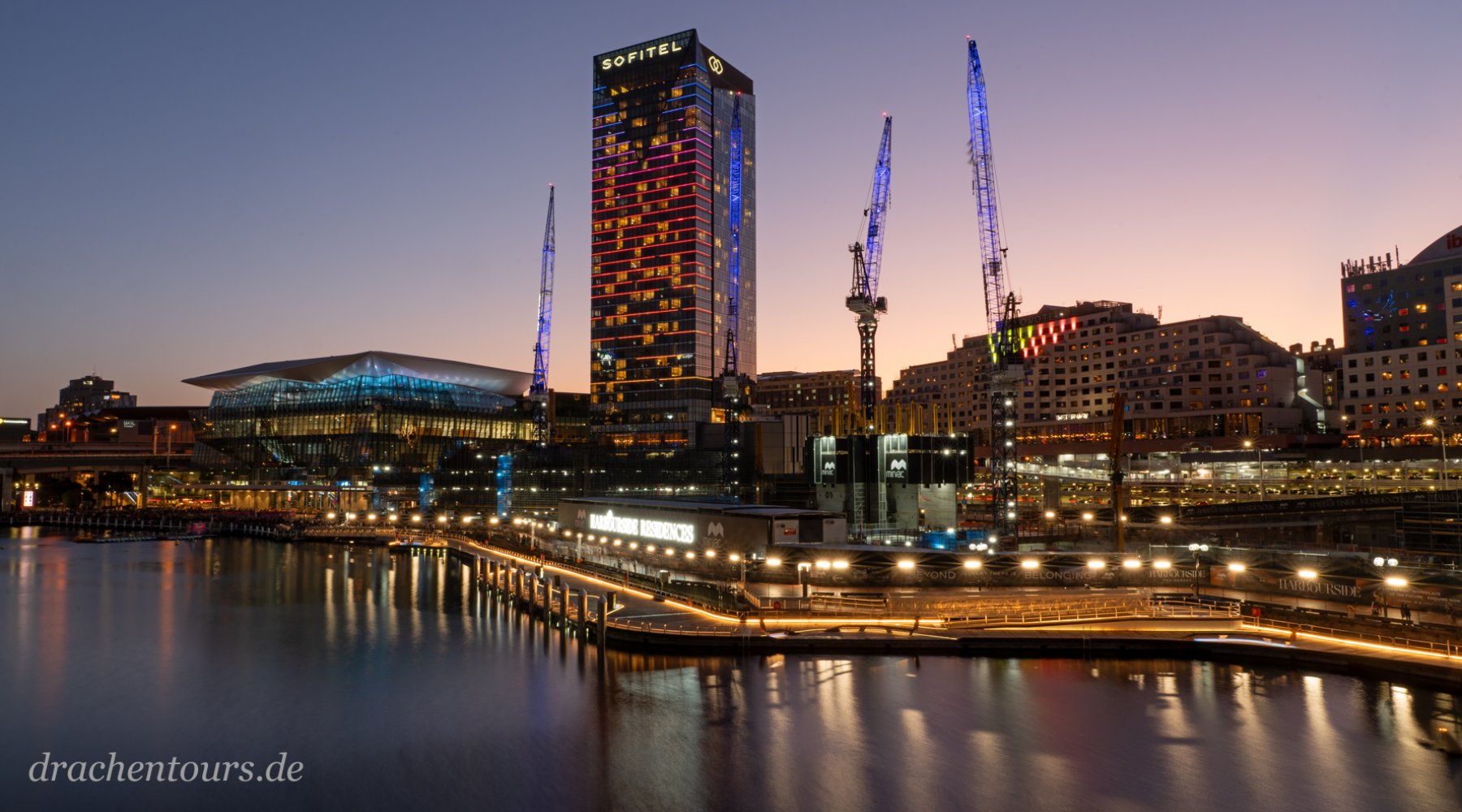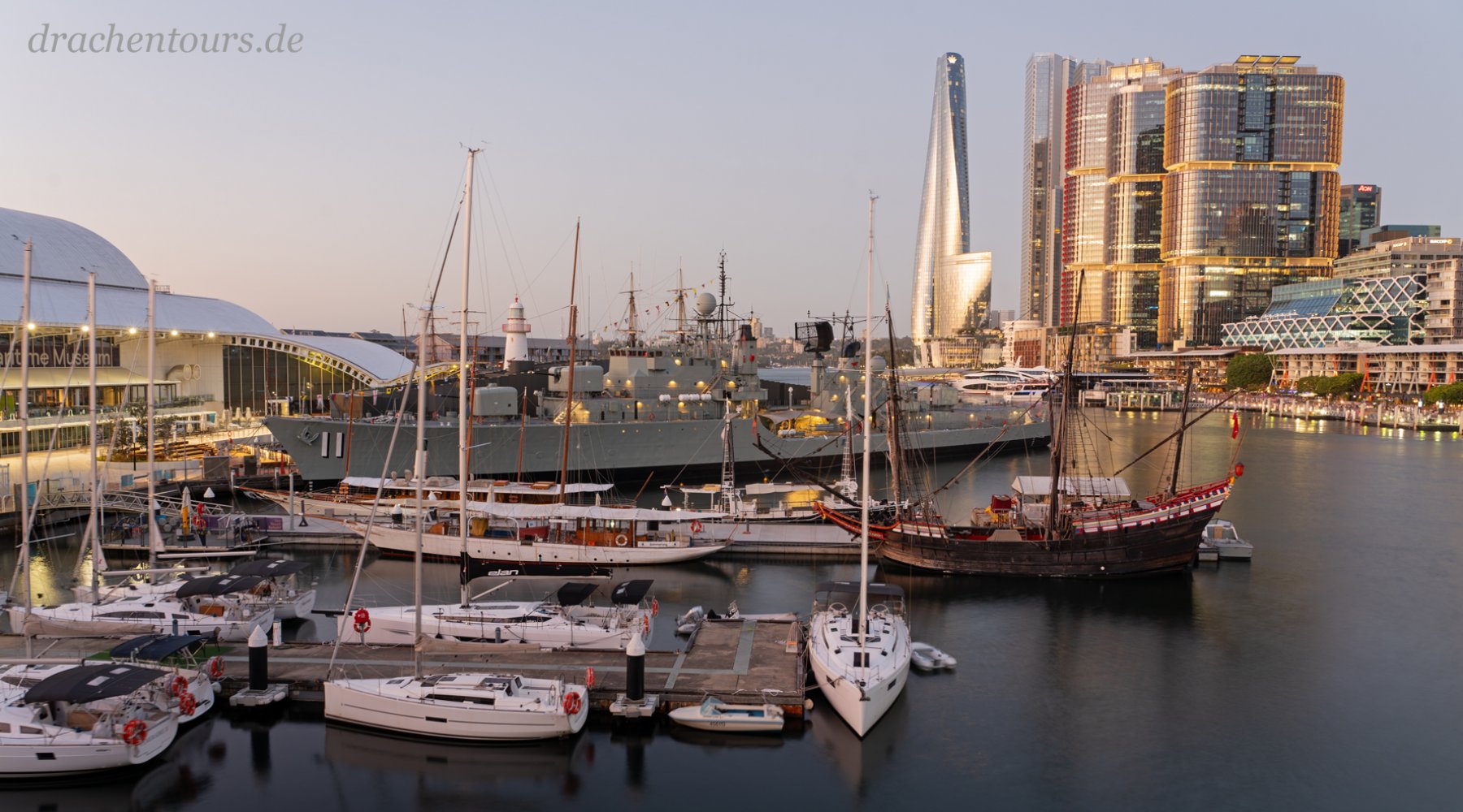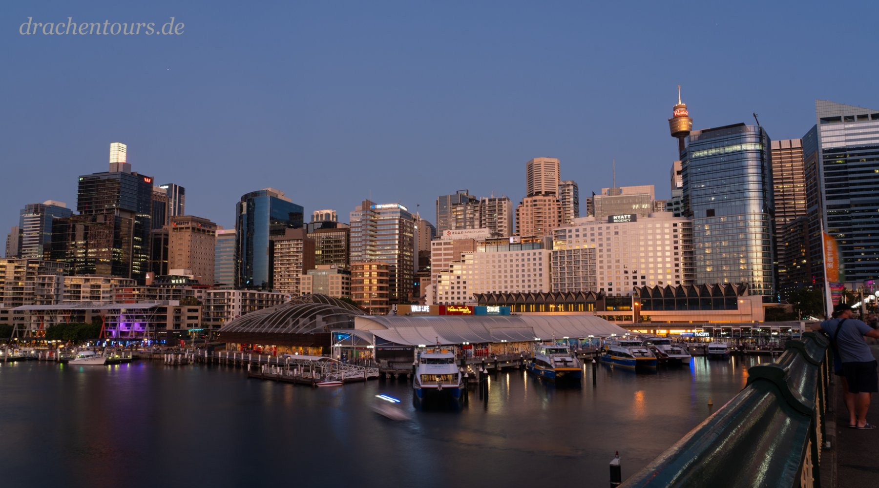 Richtig gelesen: HOSTEL, denn die Übernachtungspreise vervielfachen sich in Sydney in der letzten Woche des Jahres astronomisch. Als ich nach 4-5 Minuten Fußweg an der Pyrmont Bridge stehe und das gesamte Areal von “Darling Harbour” im Abendlicht bestaune, steht mir ein dickes Grinsen ins Gesicht geschrieben – YES !!!