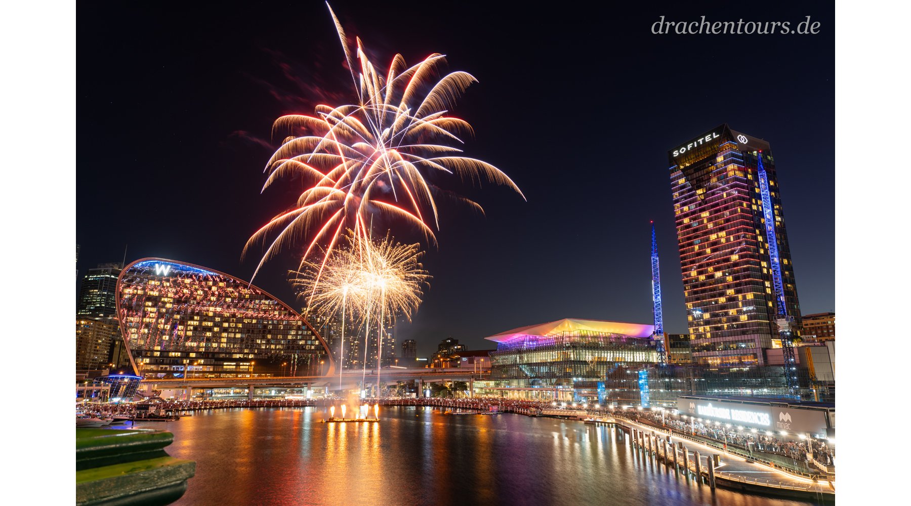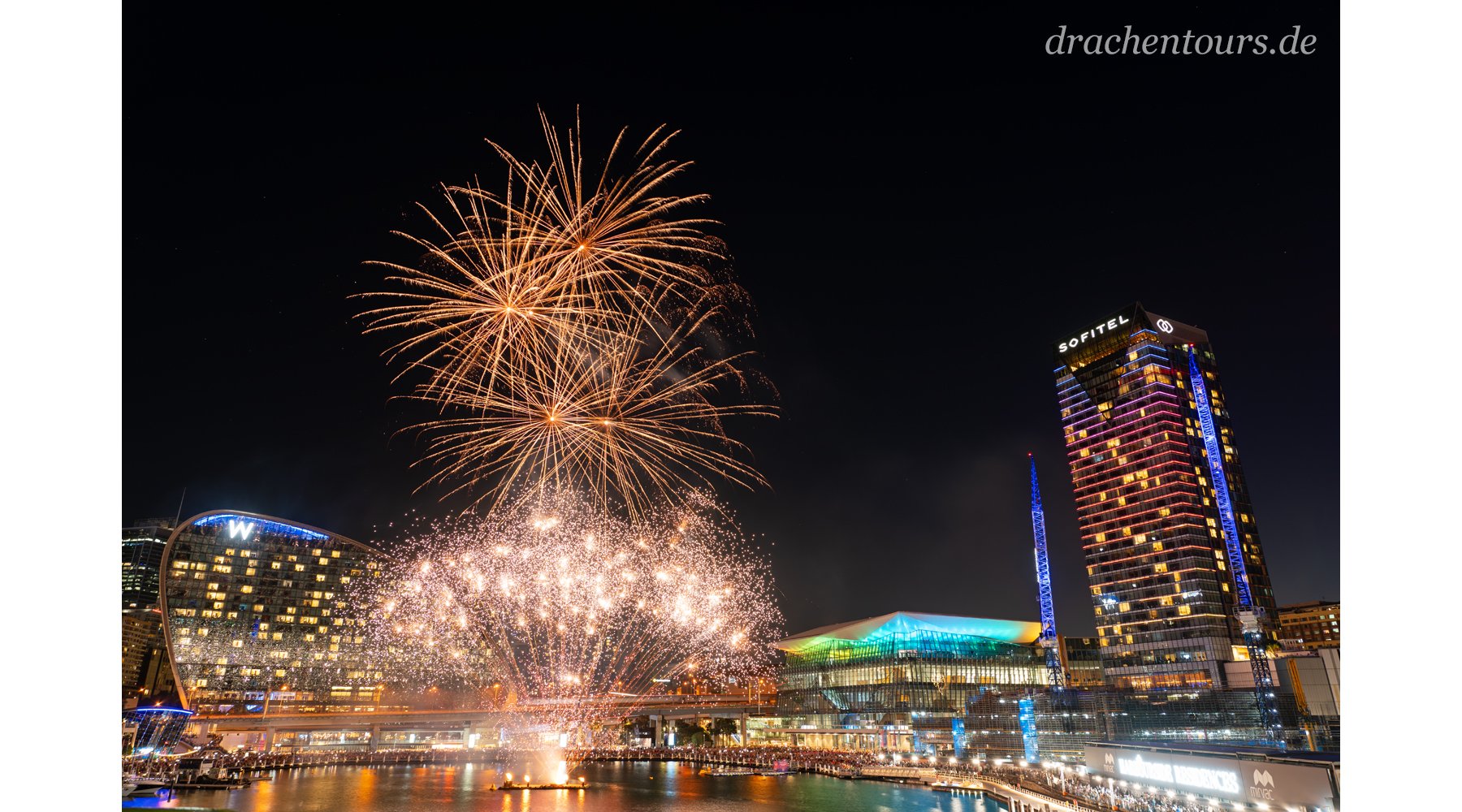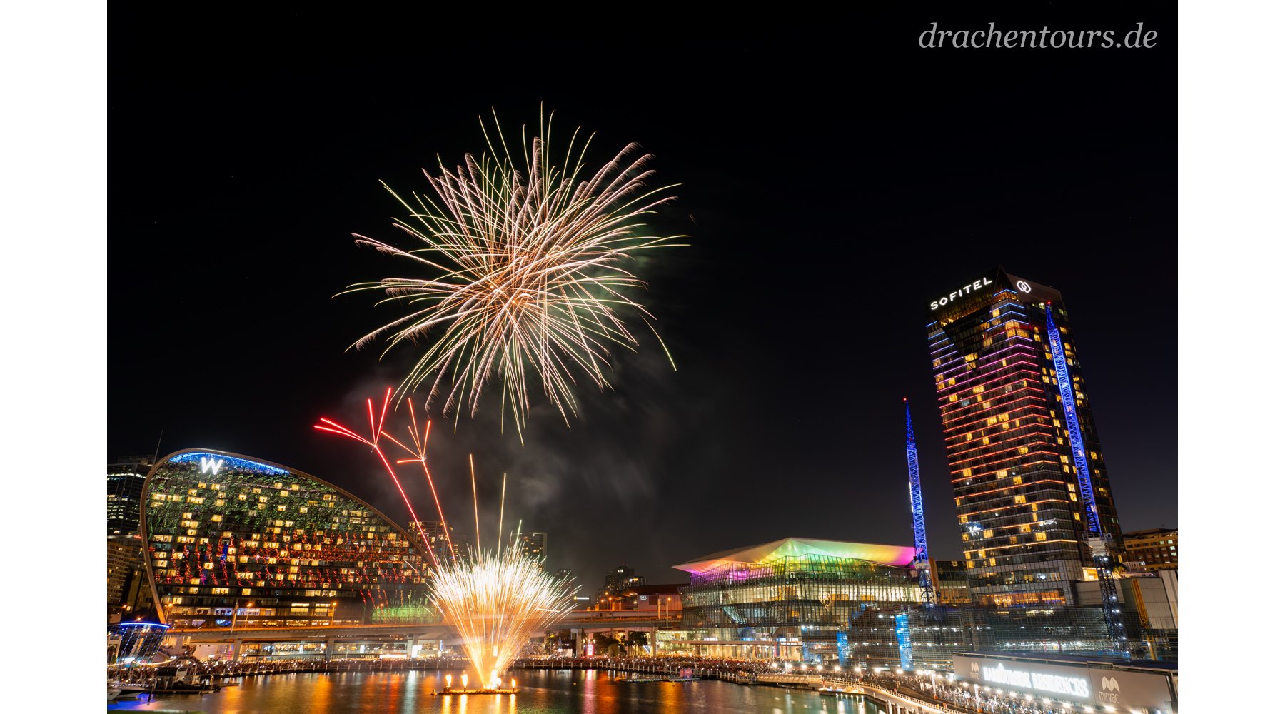 Bereits am zweiten Abend erlebe ich ein kleinen Vorgeschmack auf das bevorstehende Mega-Event. Denn jeden Samstag Abend findet um 21:00 Uhr am Darling Harbour ein kleines Feuerwerk statt. Aber seht selbst – ab Foto 02 …