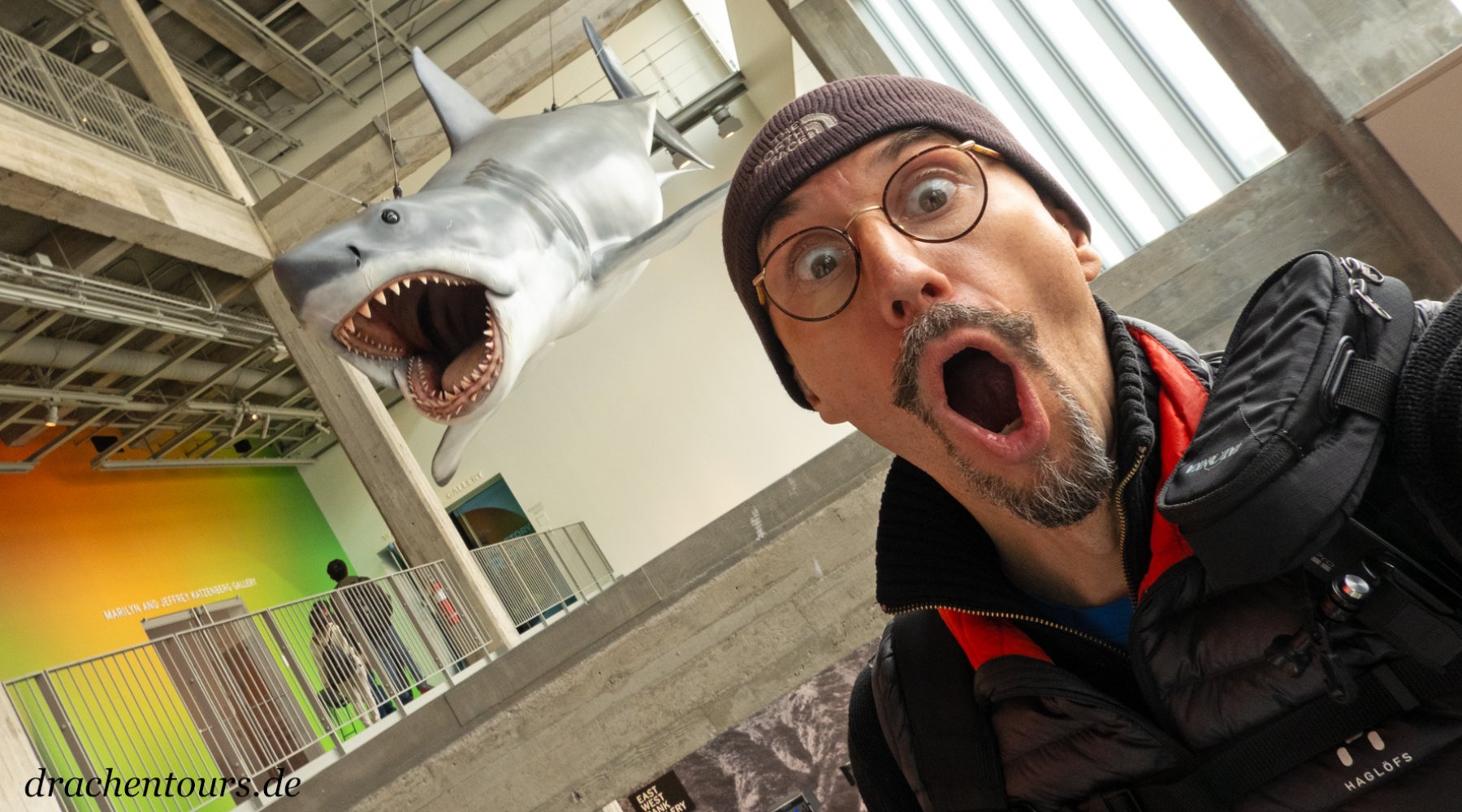 Im Hintergrund der “Hauptdarsteller” eines weiteren Meilensteins der Filmgeschichte, “Der weiße Hai”.