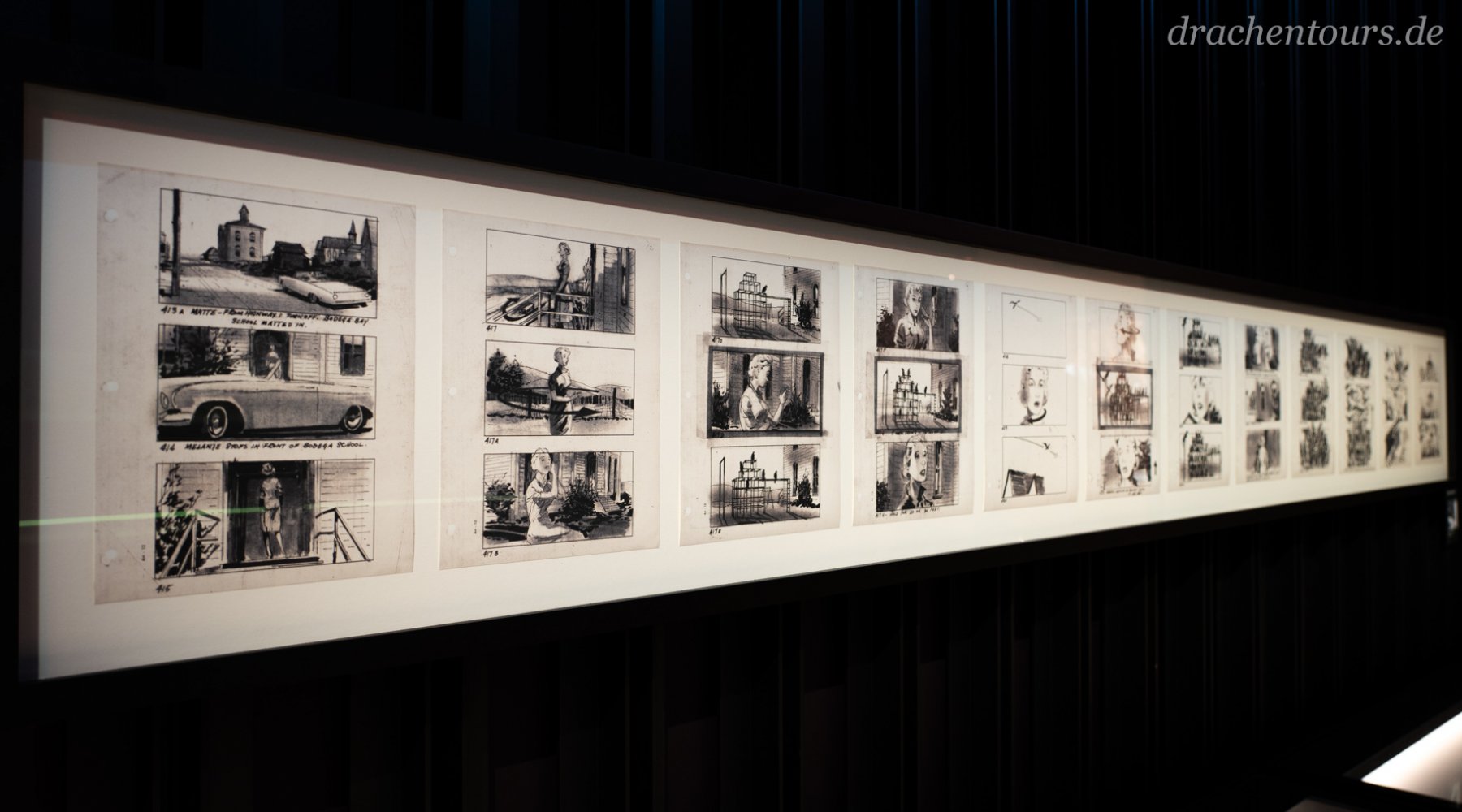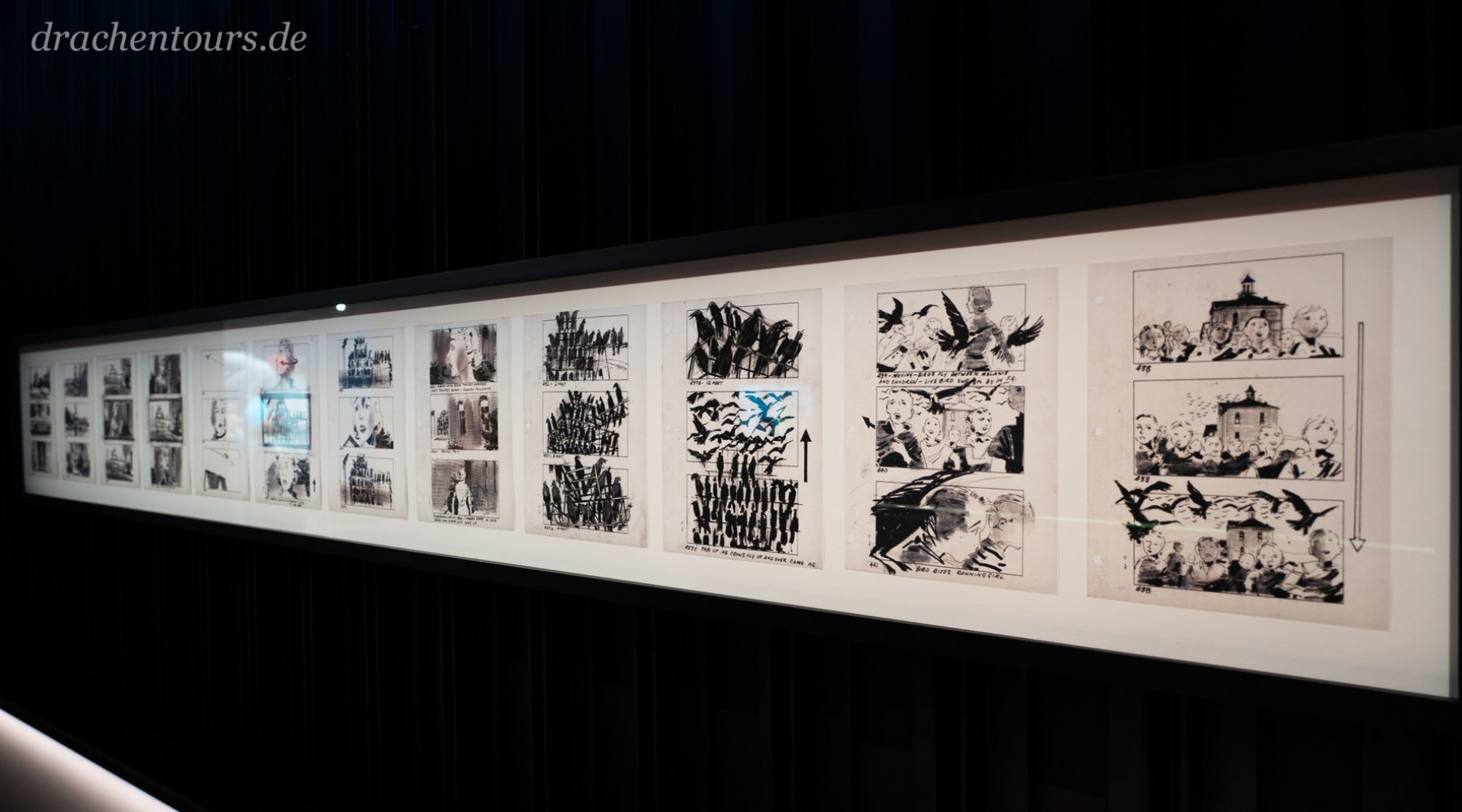 Auf den folgenden beiden Fotos sind Storyboard-Zeichnungen eines sehr bekannten Films dargestellt.