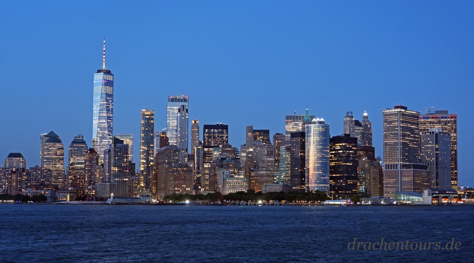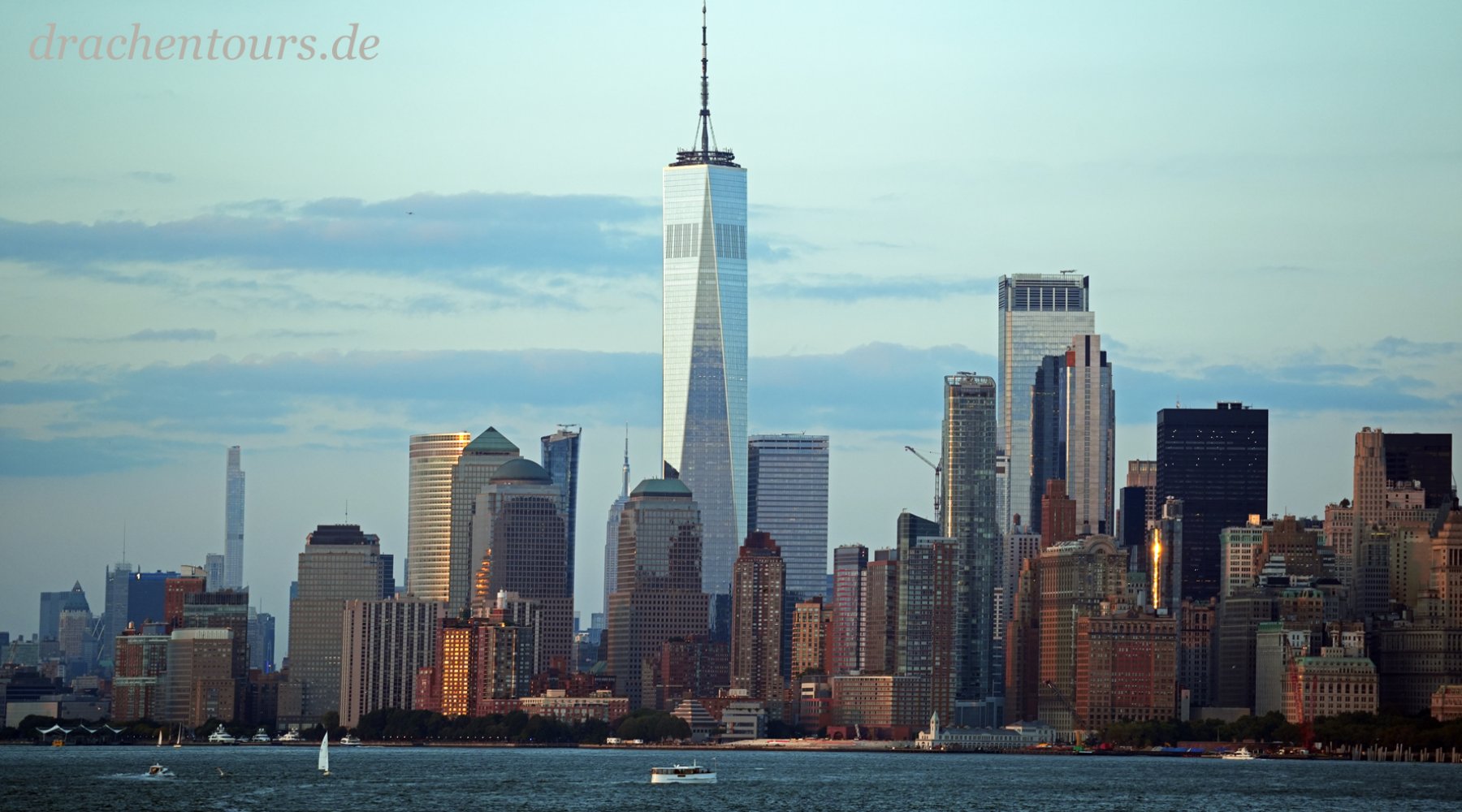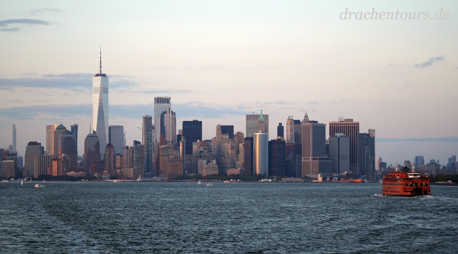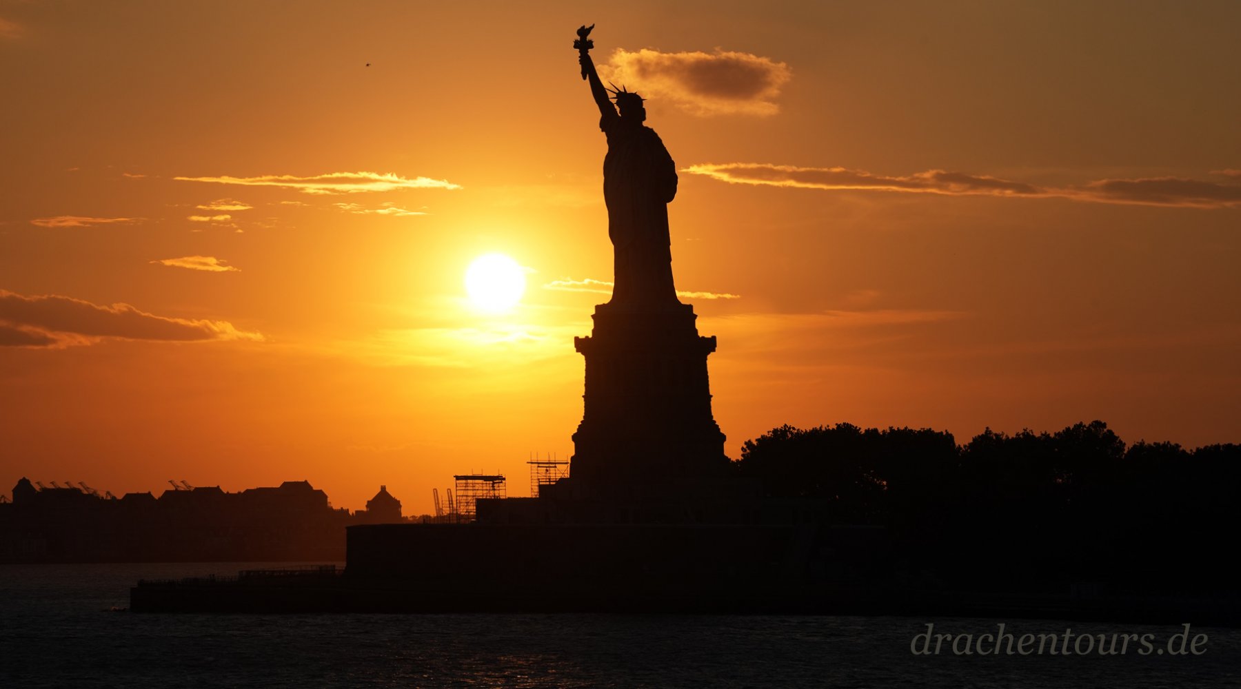 In Fahrtrichtung erblickt man sofort die Freiheitsstatue mit untergehendem Feuerball und dreht man sich um, erstrahlt die Skyline Manhattans in orangefarbenen Schimmer.
