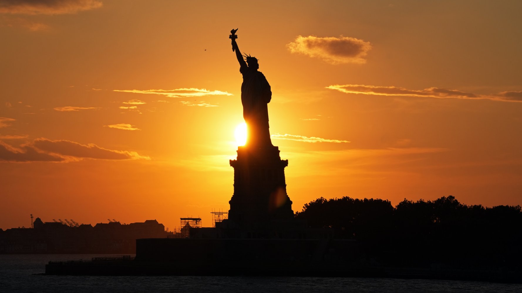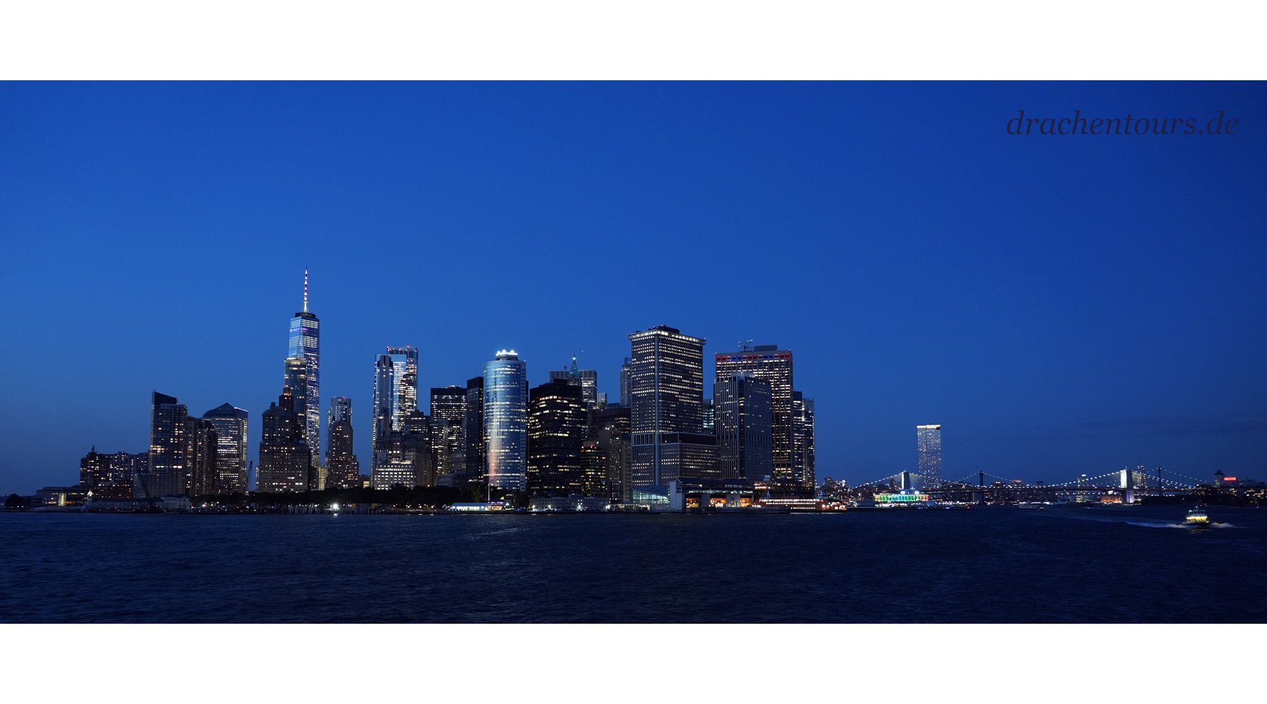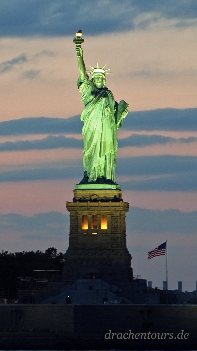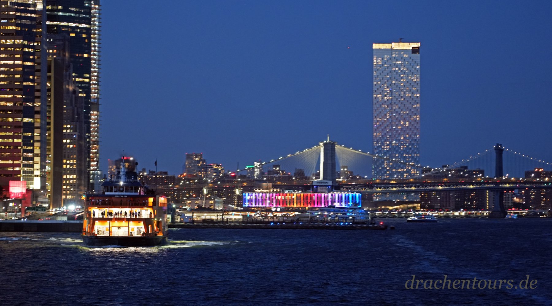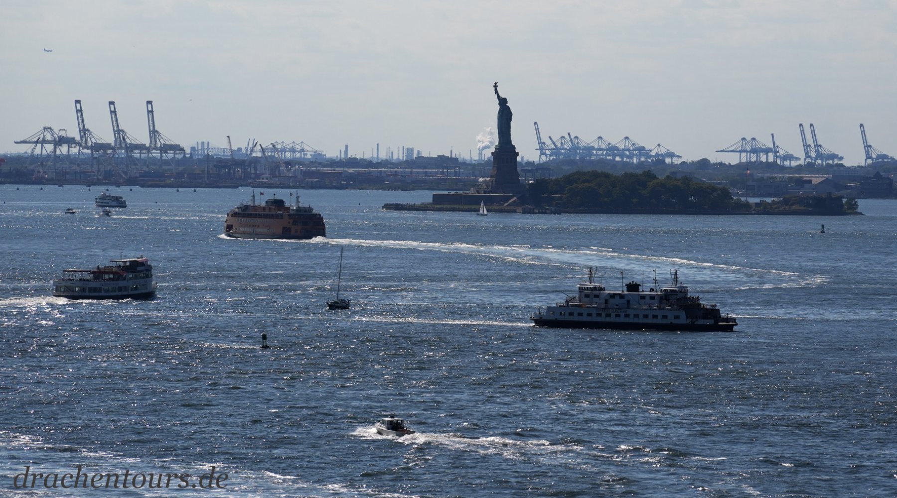 In Fahrtrichtung erblickt man sofort die Freiheitsstatue mit untergehendem Feuerball und dreht man sich um, erstrahlt die Skyline Manhattans in orangefarbenen Schimmer.