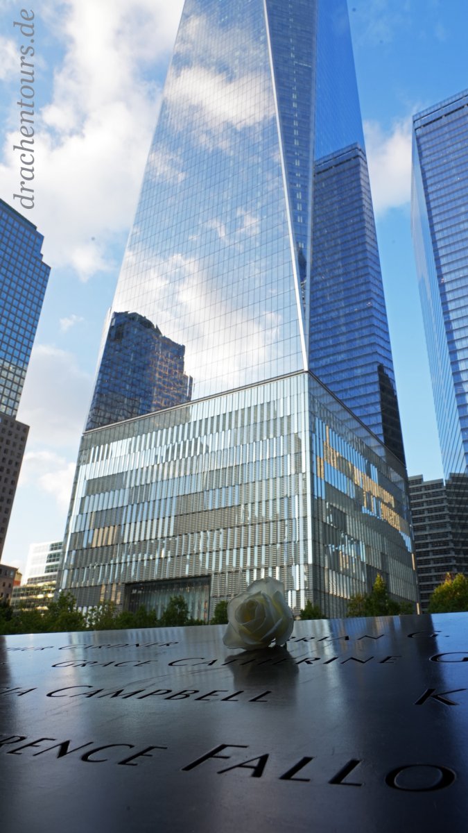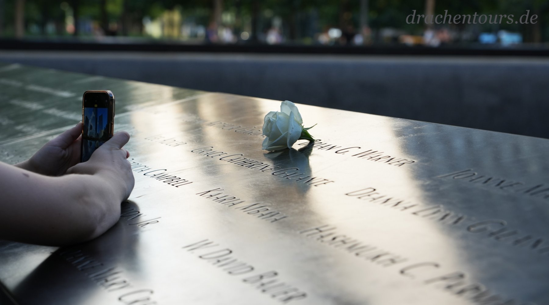 Als ich vor 10 Jahren an den Fundamenten des World Trade Centers stand, steckte eine Rose in einem der vielen Namen der Opfer, die auf der Ummantelung des Fundaments angebracht sind.
