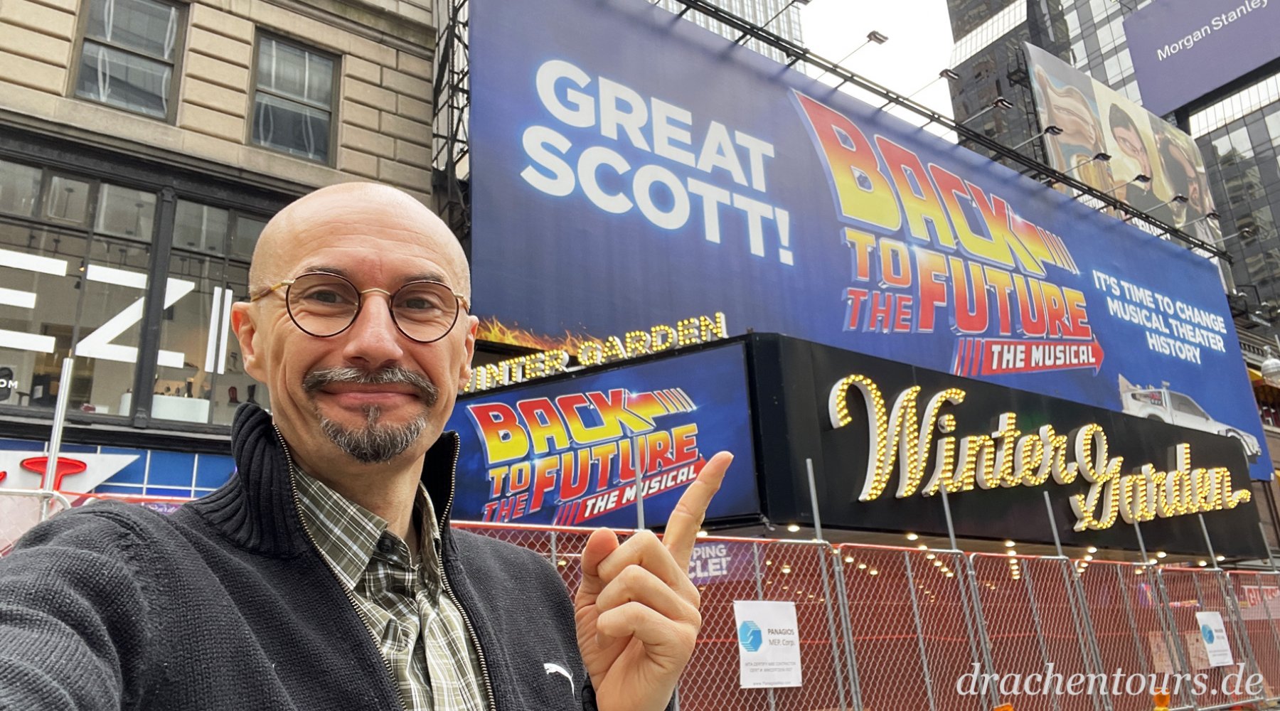 BACK TO THE FUTURE hat alle meine bisherigen Musical-Erlebnisse weit übertroffen. Was ich hier sehen, hören und erleben durfte, war für MICH einzigartig. Liegt sicherlich auch daran, dass mich die Trilogie schon sehr lange begleitet und ich die Musik von Huey Lewis und Alan Silvestri liebe. Hätte ich noch eine weitere Nacht in N.Y. gehabt, wäre ich wahrscheinlich … ;-)