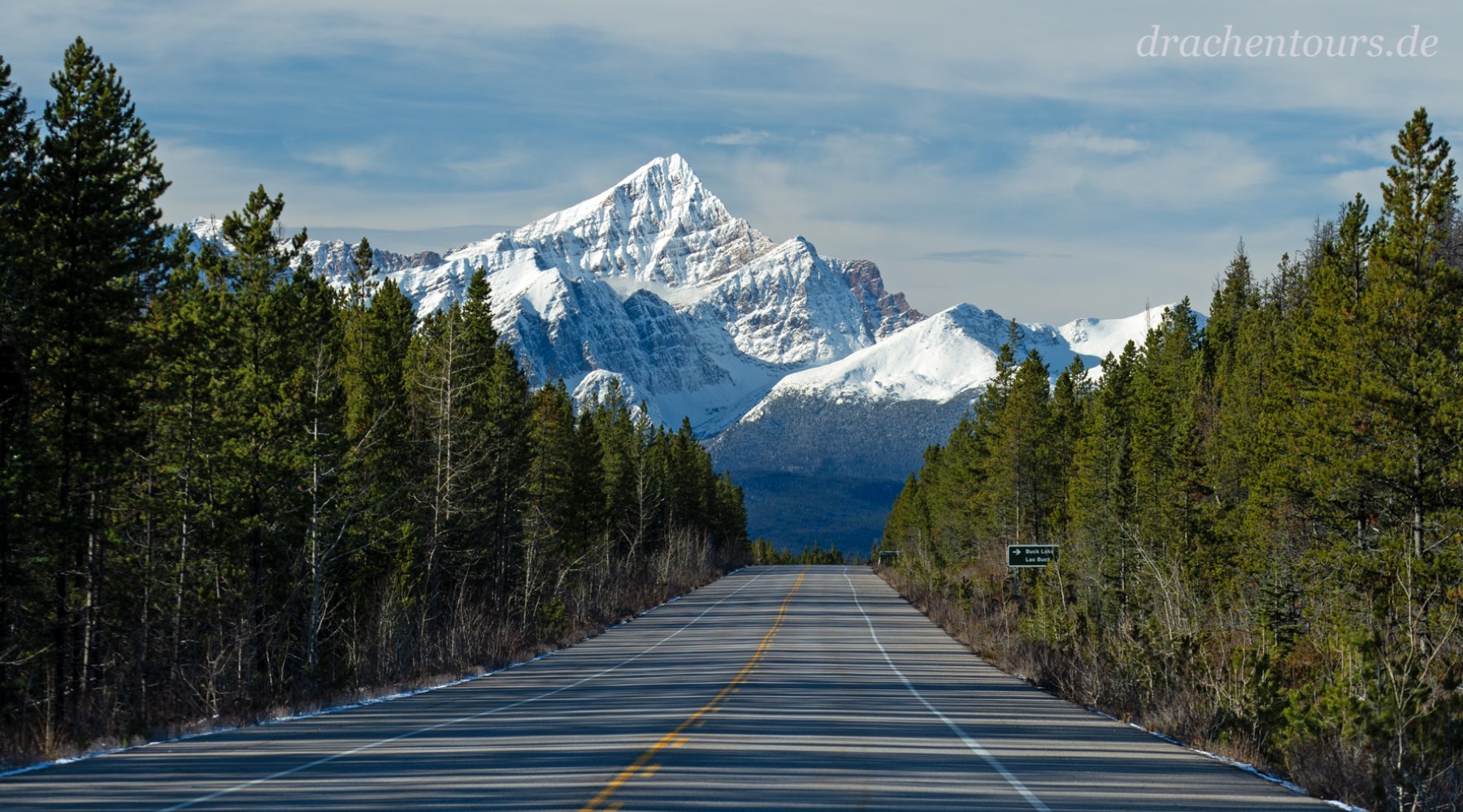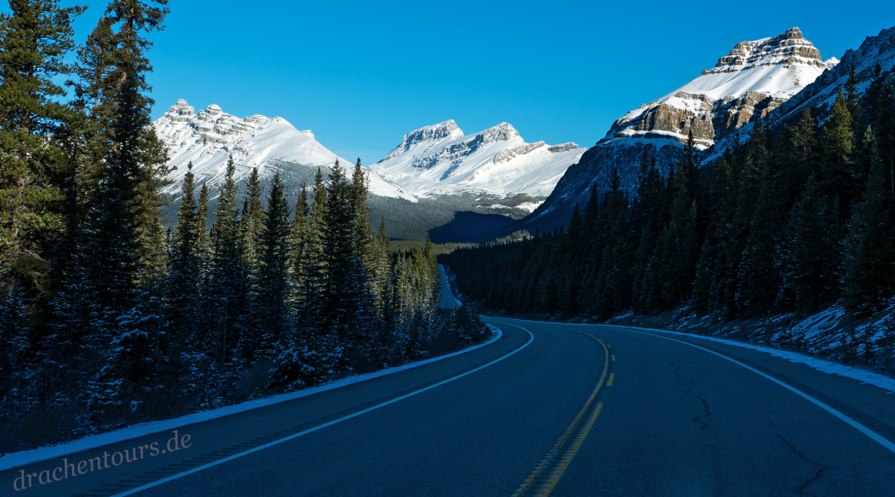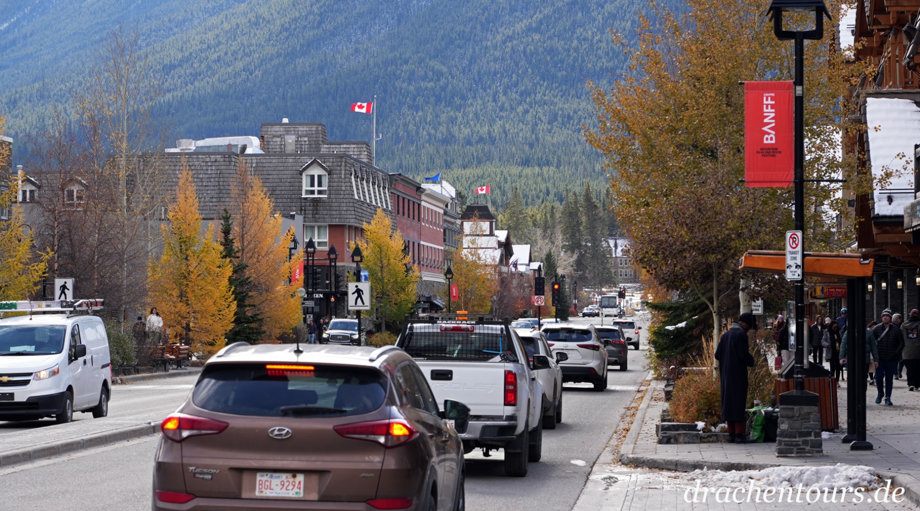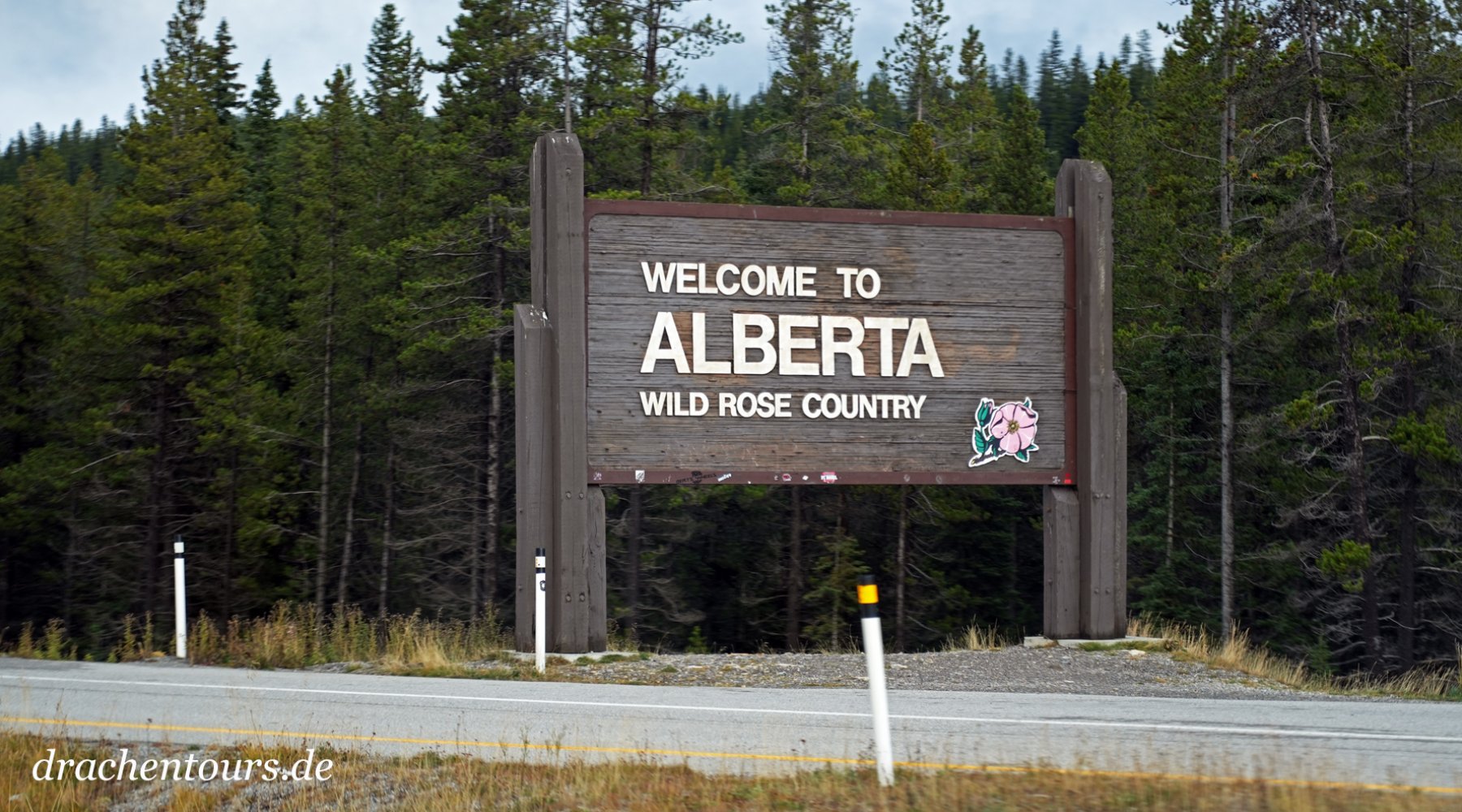 Ein paar Kilometer bevor ich am Lake Louise ankomme, überquere ich die Grenze zwischen den Provinzen British Columbia und Alberta. Die Rocky Mountains liegen quer im Westen Kanadas (von rechts unten nach links oben) und sind Teil beider Provinzen.