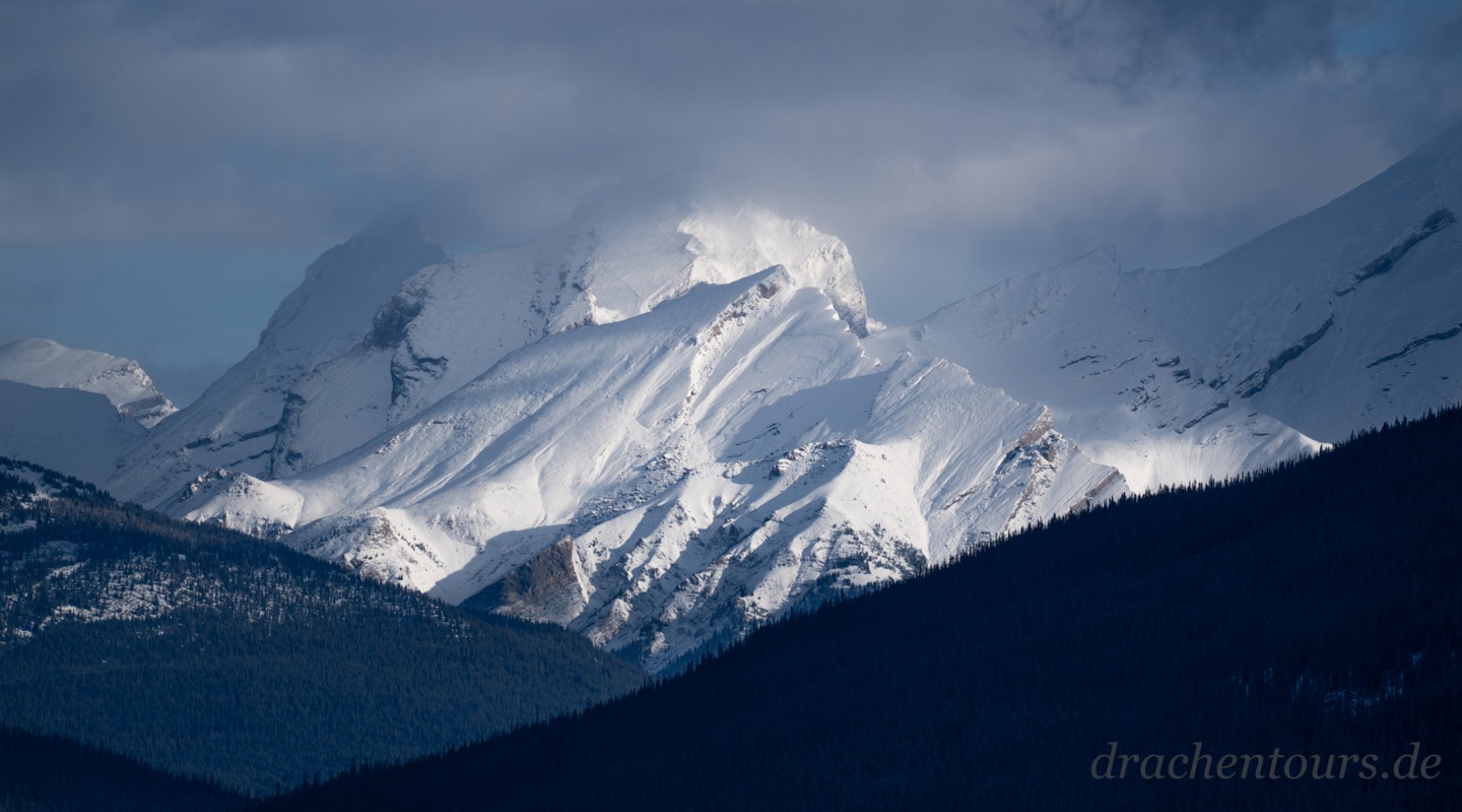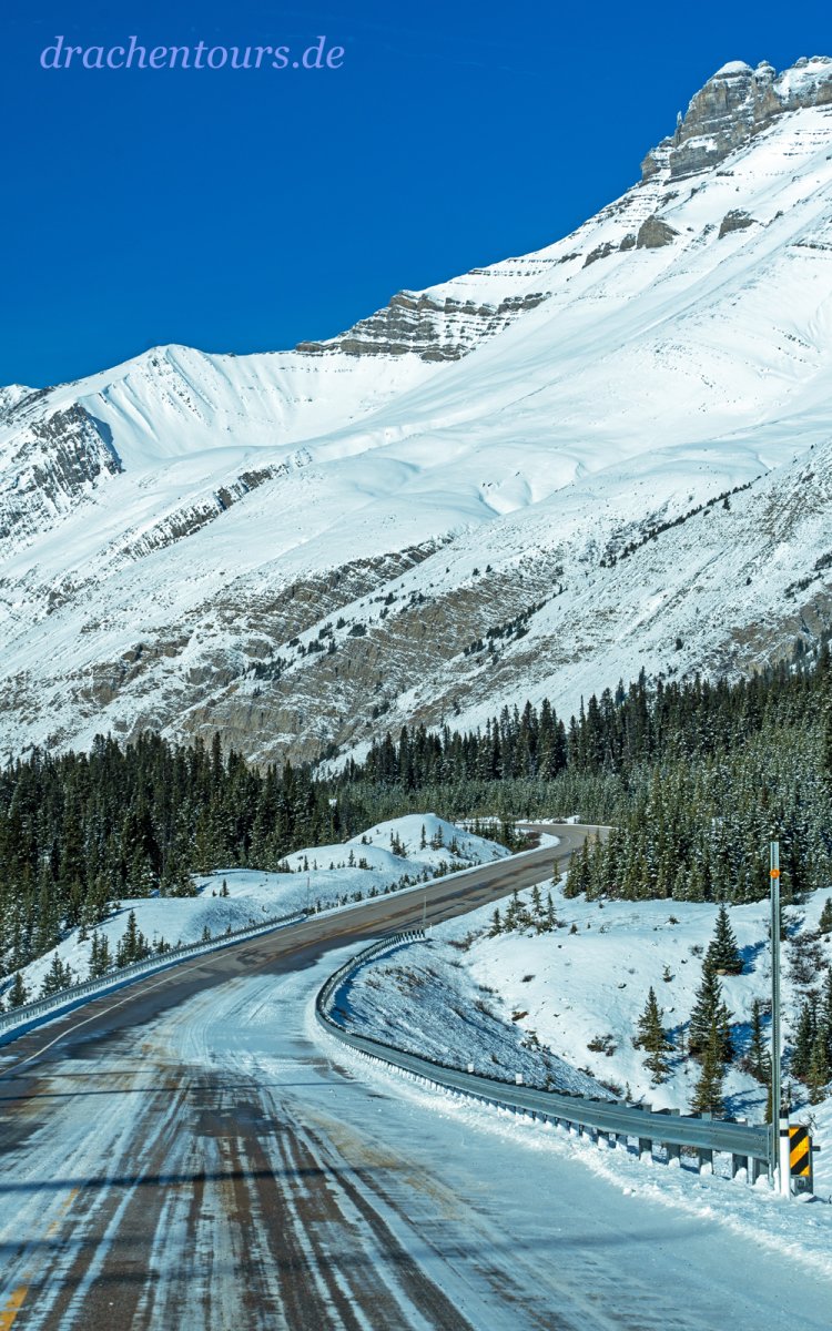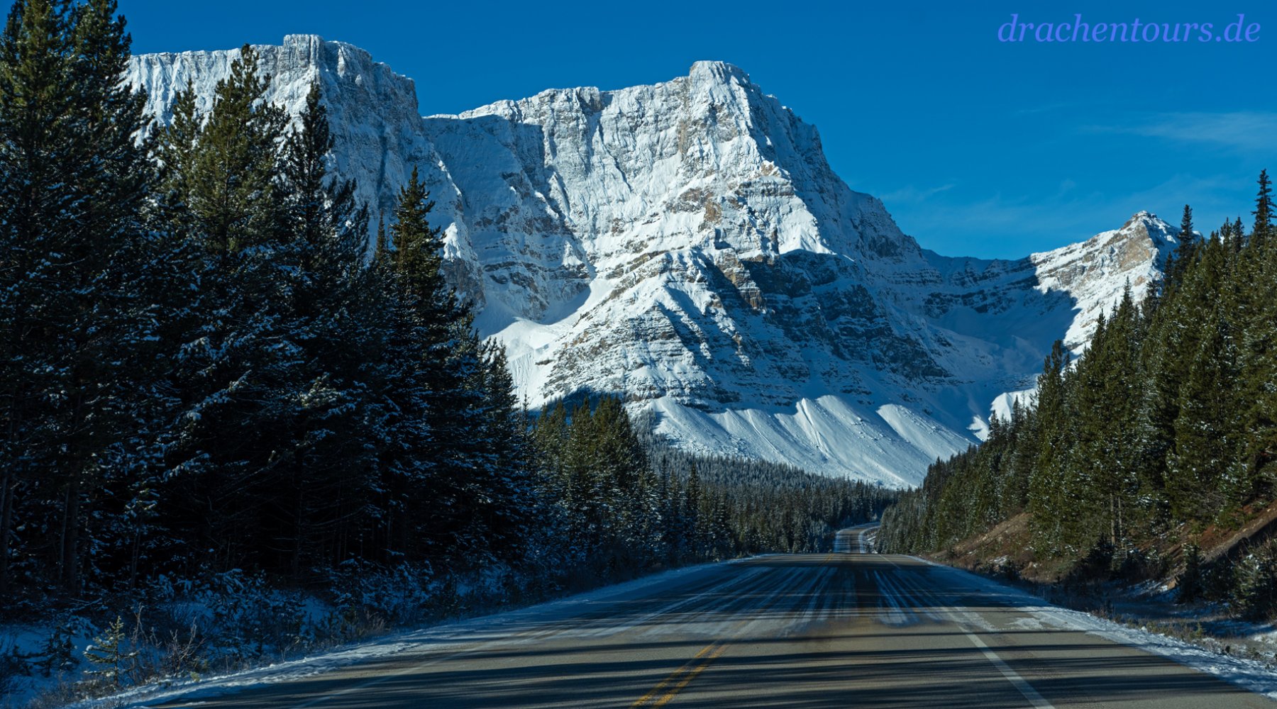Ein paar Kilometer bevor ich am Lake Louise ankomme, überquere ich die Grenze zwischen den Provinzen British Columbia und Alberta. Die Rocky Mountains liegen quer im Westen Kanadas (von rechts unten nach links oben) und sind Teil beider Provinzen.