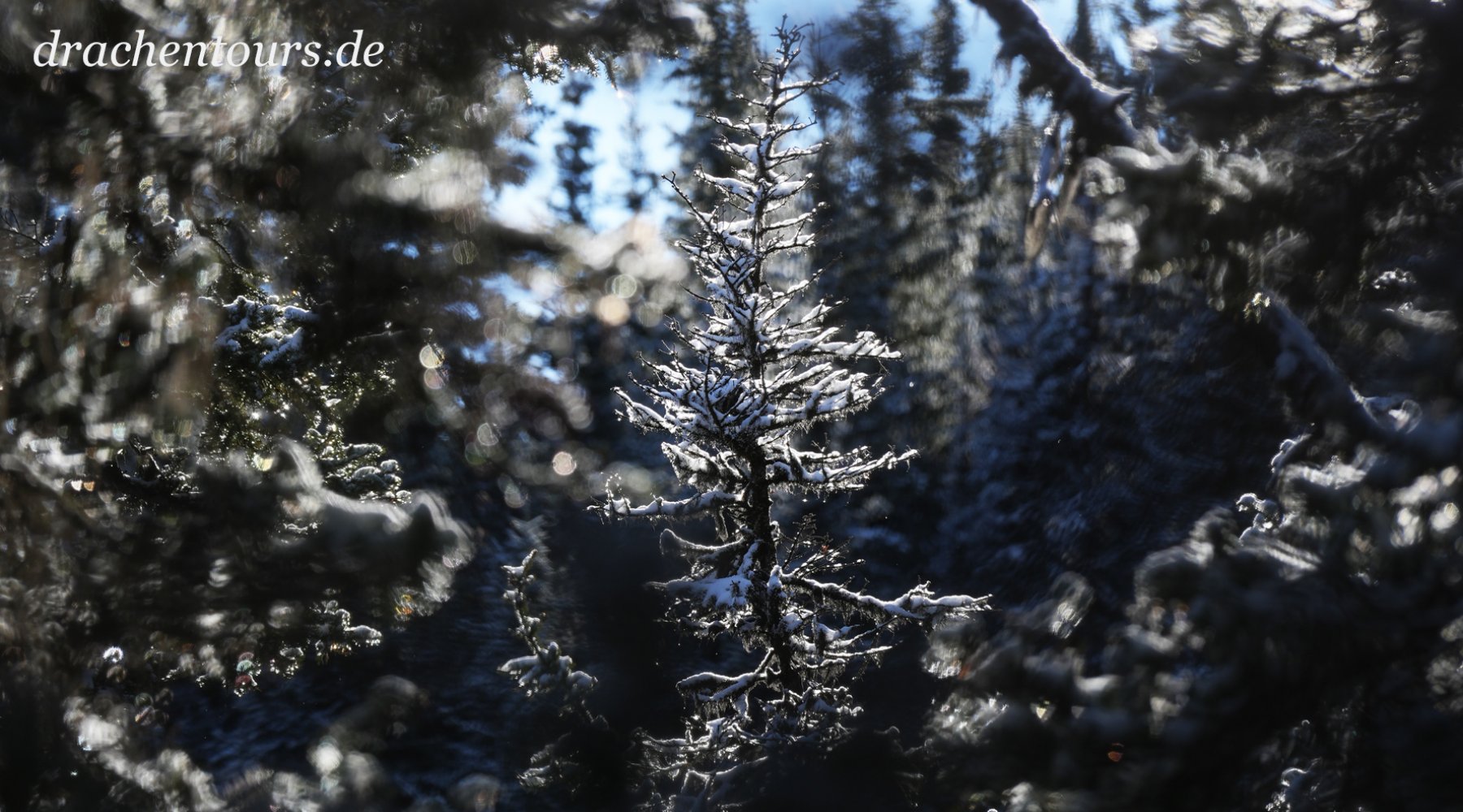 Also nichts wie hoch durch einen “puderweißen” Wald zum Aussichtspunkt wandern – eigentlich keine schlechte Alternative.